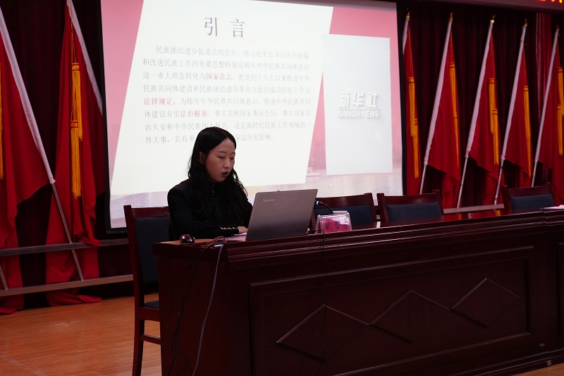 授课中,武雪芳老师以《中华人民共和国民族团结进步促进法》为核心,紧扣新时代民族工作主线,跳出法条解读单一模式,全方位、深层次解读立法初衷、核心条款与实践要求。她立足康乐镇基层民族工作实际,结合铸牢中华民族共同体意识特色示范小镇建设现状,摒弃抽象理论说教,用鲜活生动的本地实践案例,从“深刻认识民族团结进步促进法颁布的重要意义、准确把握民族团结进步促进法的重点内容、全面推动民族团结进步促进法落地见效”三个维度展开讲解,重点阐释法律在促进各民族交往交流交融、维护社会和谐稳定、助力乡村振兴等方面的实操要点,深入解读铸牢中华民族共同体意识的深刻内涵,让干部群众清晰掌握法律适用场景,切实提升运用法治思维解决民族工作问题的能力,引导参会人员深刻认识民族团结是镇域高质量发展和特色示范小镇建设的重要保障。