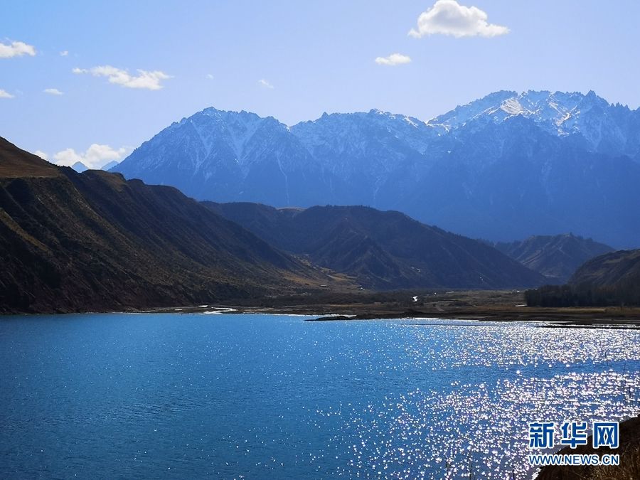 位于祁连山下的甘肃省张掖市肃南裕固族自治县的马蹄藏族乡,秋草泛黄,羊群悠闲食草, 水库清澈,树叶金黄,与蓝天白云和祁连山积雪相映景观优美,惹人陶醉。