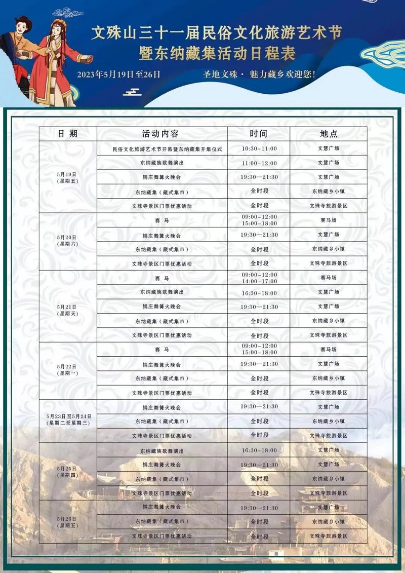 为深入学习宣传贯彻党的二十大精神,进一步加快文旅产业发展步伐,实现以节招商、以节会友、以节增收、以节富民目标,祁丰藏族乡于2023年5月19日——5月26日举办文殊山第三十一届民俗文化旅游艺术节暨东纳藏集系列活动。活动以“畅游圣地文殊·乐享藏韵风情”为主题,以宣传推介、文艺演出、美食品鉴、祈福许愿等活动为载体,同步开展第一期“东纳藏集”和“文艺活动周”系列活动。