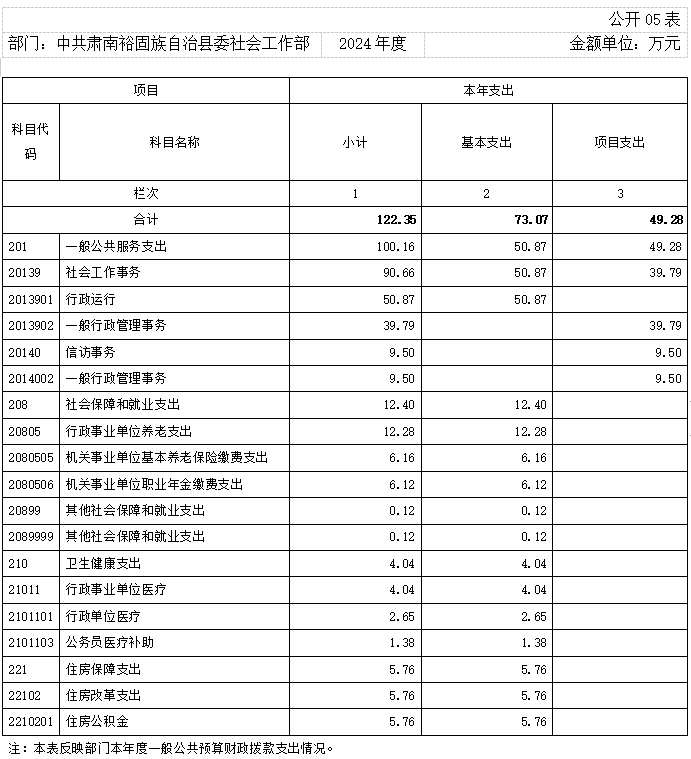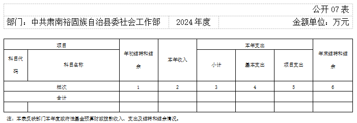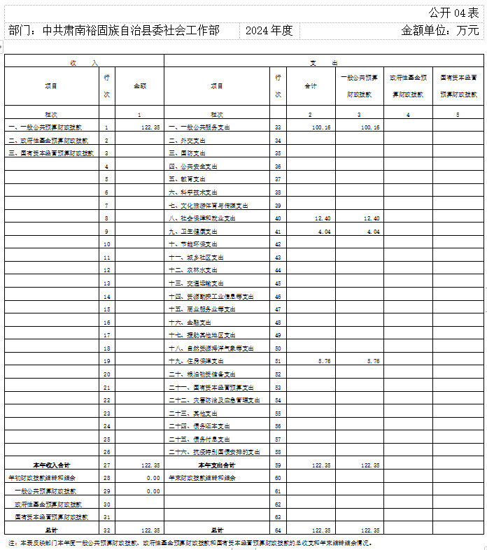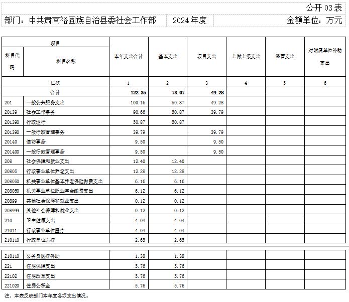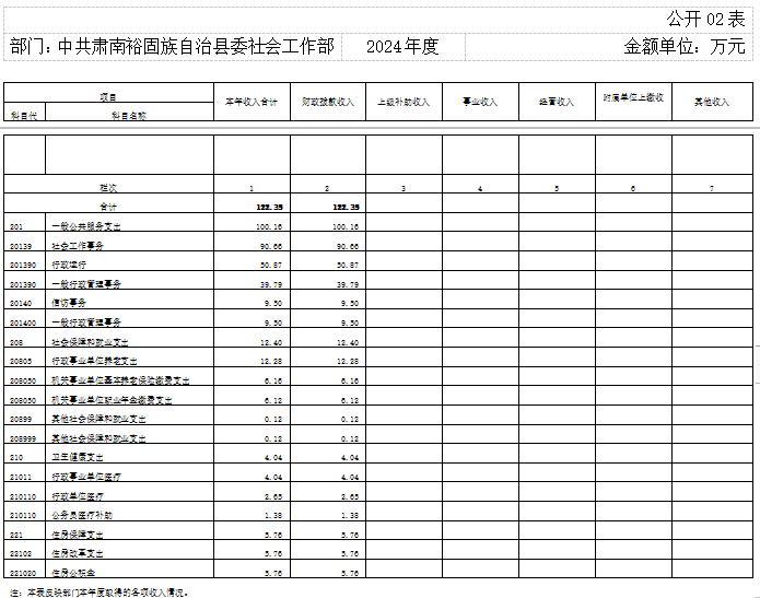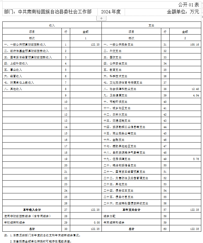 2024年度收、支总计均为122.35万元。与上年度相比,收、支总计各增加122.35万元,增长0.00%,主要原因是中共肃南裕固族自治县委社会工作部为新增单位,2024年5月7日中共肃南县委、肃南县人民政府《关于印发肃南裕固族自治县机构改革方案的通知》(县委发〔2024〕14号),设置县委社会工作部,6月7日,中共肃南裕固族自治县委社会工作部举行挂牌仪式,当天县委社会工作部班子成员全部到位,正式组建,为县委职能部门,正科级,加挂县委“两新”工委牌子,加挂县信访局牌子。
