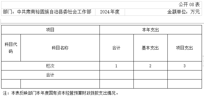 2024年度财政拨款收、支总计均为122.35万元。与上年相比,各增加122.35万元,增长0.00%。主要原因是中共肃南裕固族自治县委社会工作部为新增单位,2024年5月7日中共肃南县委、肃南县人民政府《关于印发肃南裕固族自治县机构改革方案的通知》(县委发〔2024〕14号),设置县委社会工作部,6月7日,中共肃南裕固族自治县委社会工作部举行挂牌仪式,当天县委社会工作部班子成员全部到位,正式组建,为县委职能部门,正科级,加挂县委“两新”工委牌子,加挂县信访局牌子。