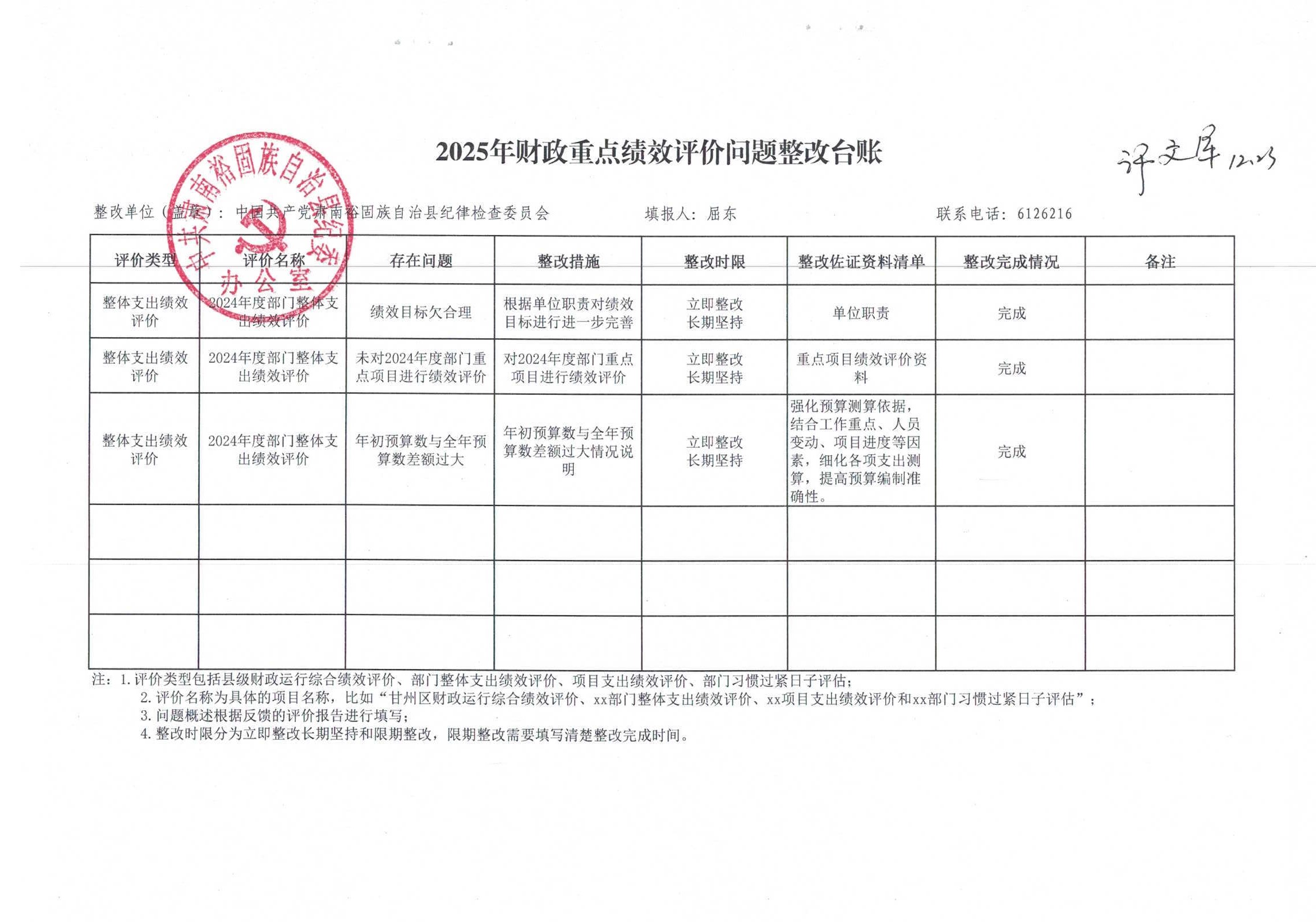 2.整改措施:一是补做2024年度重点项目绩效评价,采用资料核查、实地调研、数据核验等方式,对2个重点项目的资金使用、实施进度、效益产出等进行全面评价,形成专项评价报告;二是建立常态化评价机制,明确每年第四季度开展重点项目绩效评价,将评价结果与下年度预算安排挂钩;三是组建内部评价小组,抽调业务骨干与财务人员参加评价培训,提升自主评价能力。