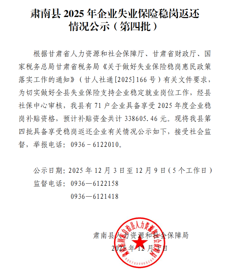肃南县2025年企业失业保险稳岗返还情况公示(第四批)