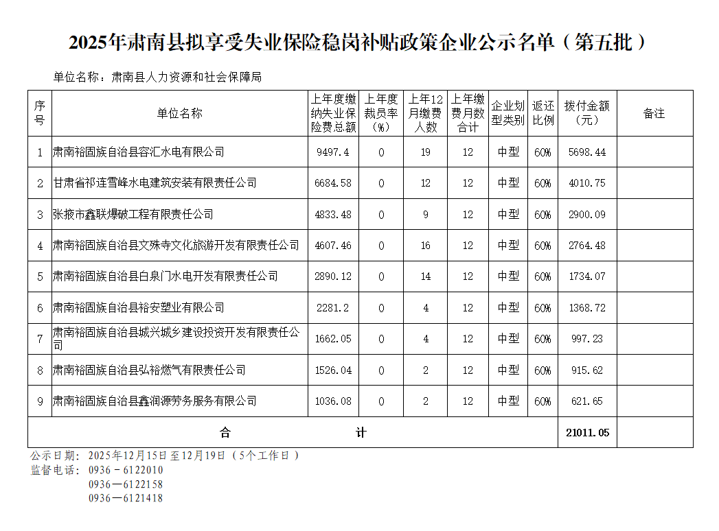 根据甘肃省人力资源和社会保障厅、甘肃省财政厅、国家税务总局甘肃省税务局《关于做好失业保险稳岗惠民政策落实工作的通知》(甘人社通[2025]166号)有关文件要求,为切实做好全县失业保险支持企业稳定就业岗位工作,经县社保中心审核,我县有9户企业具备享受2025年度企业稳岗补贴资格,预计补贴资金共计21011.05元。现将我县第四批具备享受稳岗返还企业有关情况公示如下(具体见附件),接受社会监督,举报电话:0936-6122010。