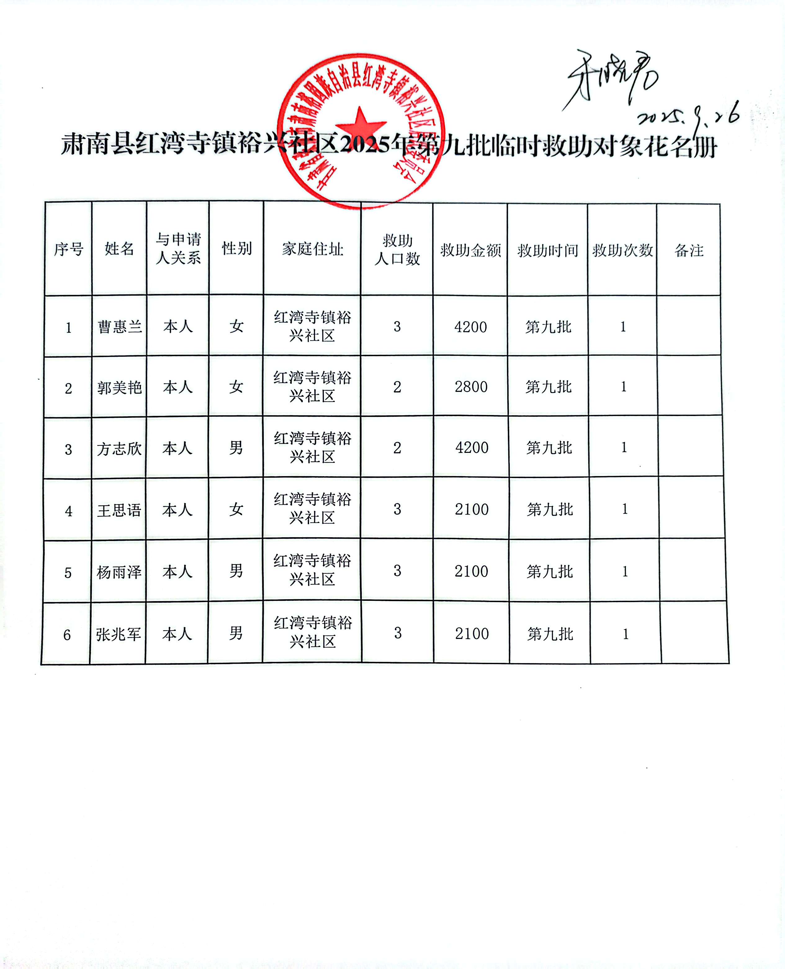 现将肃南县红湾寺镇裕兴社区2025年第九批临时救助对象花名册公示如下: