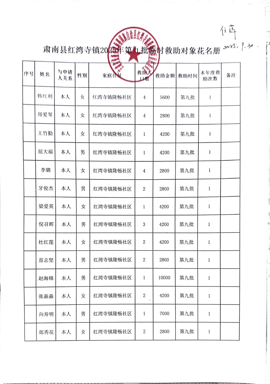 现将肃南县红湾寺镇隆畅社区2025年第九批临时救助对象花名册公示如下: