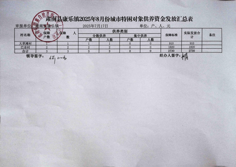 肃南县康乐镇2025年8月份城市特困对象供养资金发放汇总表