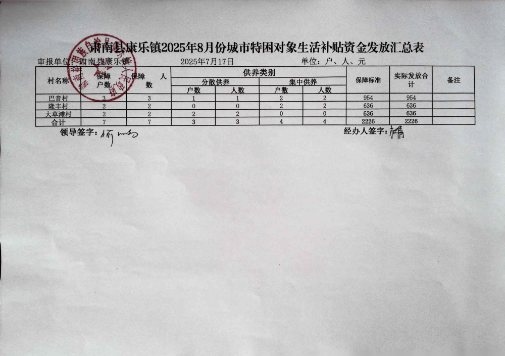 肃南县康乐镇2025年8月份城市特困对象生活补贴资金发放汇总表