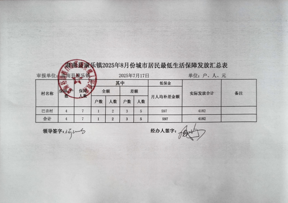肃南县康乐镇2025年8月份城市居民最低生活保障发放汇总表