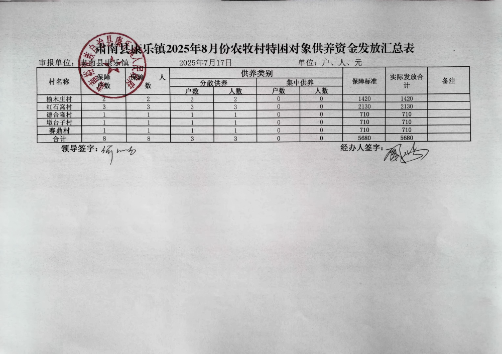 肃南县康乐镇2025年8月份农牧村特困对象供养资金发放汇总表