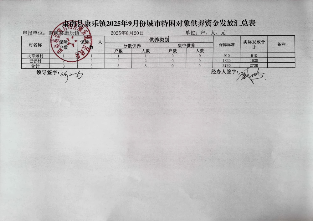 肃南县康乐镇2025年9月份城市特困对象供养资金发放汇总表