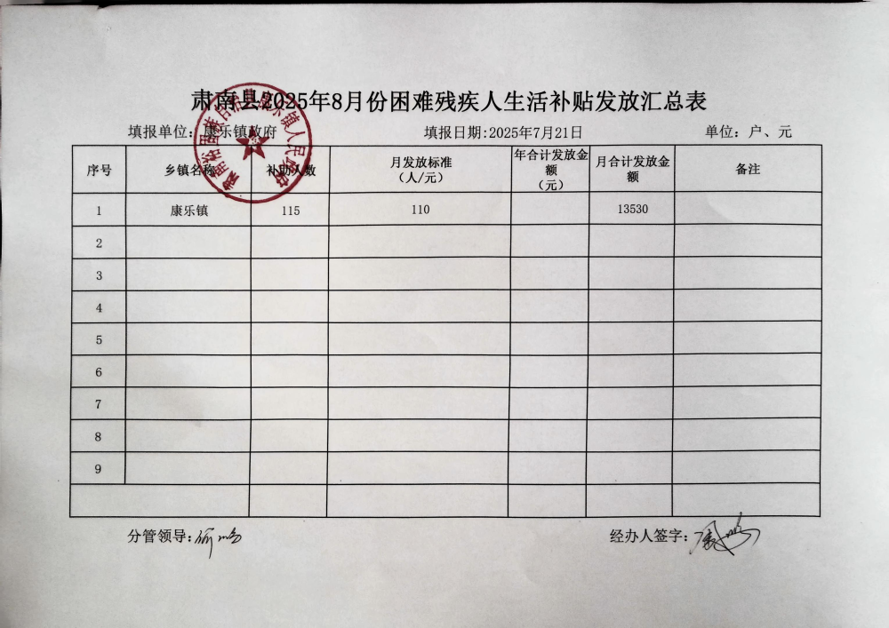 肃南县康乐镇2025年8月份困难残疾人生活补贴发放汇总表