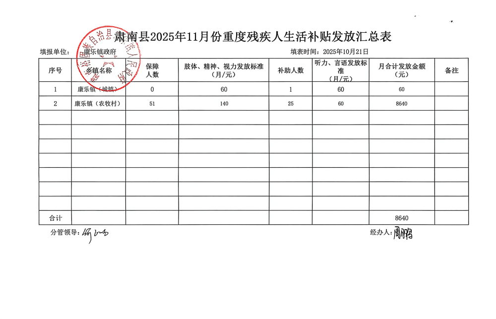 肃南县康乐镇2025年11月份重度残疾人生活补贴发放汇总表