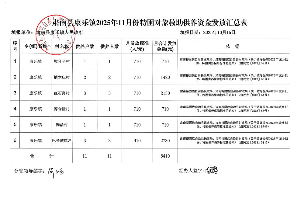 肃南县康乐镇2025年11月特困对象救助供养资金发放汇总表