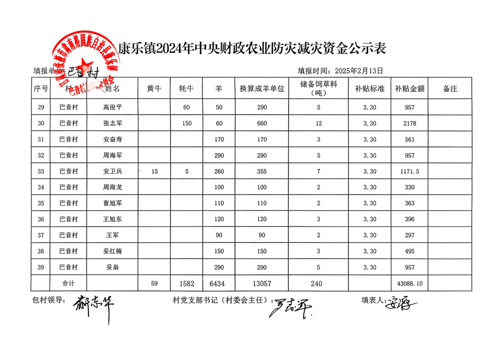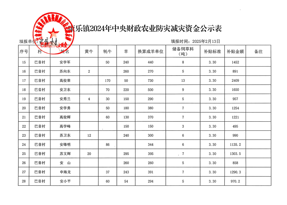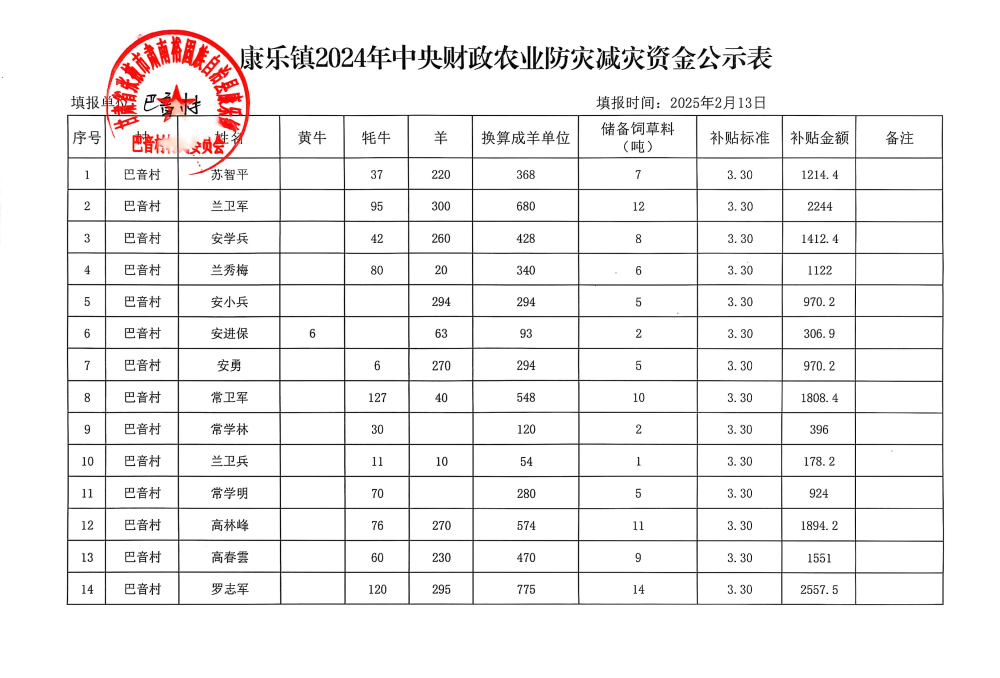 康乐镇巴音村2024年中央财政农业防灾减灾资金公示表