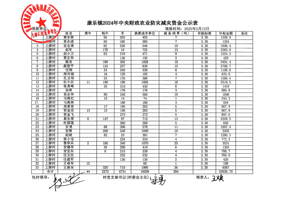 康乐镇上游村2024年中央财政农业防灾减灾资金公示表