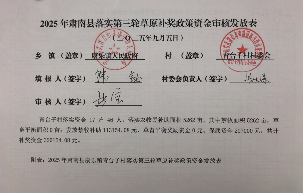 2025年肃南县康乐镇青台子村落实第三轮草原补奖政策资金审核发放表
