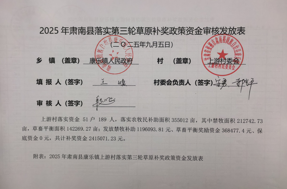 2025年肃南县康乐镇上游村落实第三轮草原补奖政策资金审核发放表