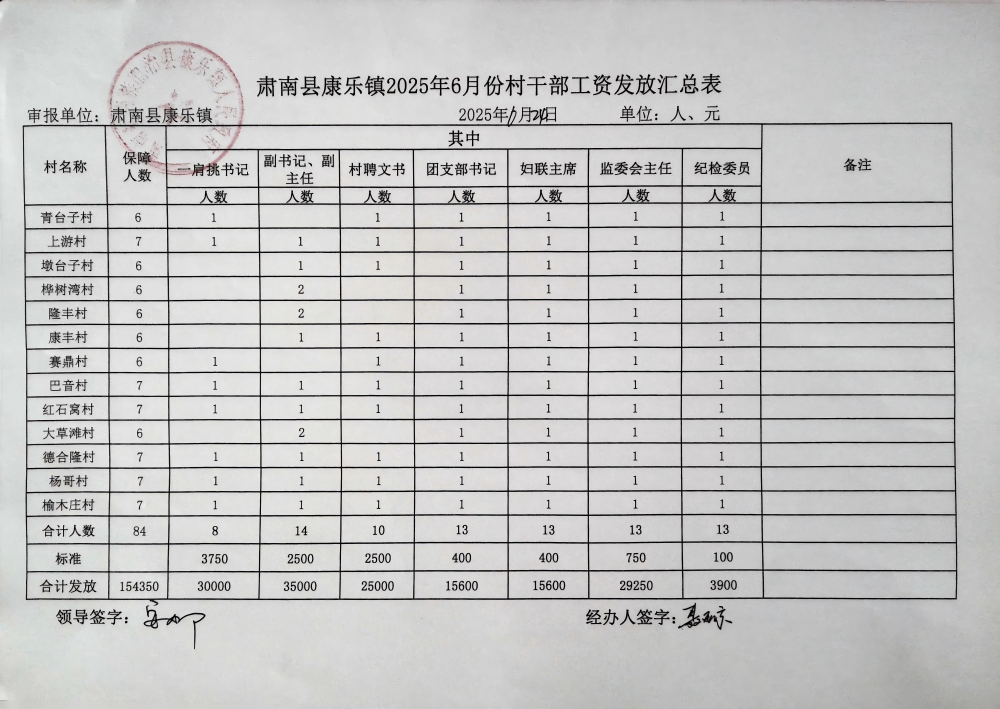 肃南县康乐镇2025年6月份村干部工资发放汇总表