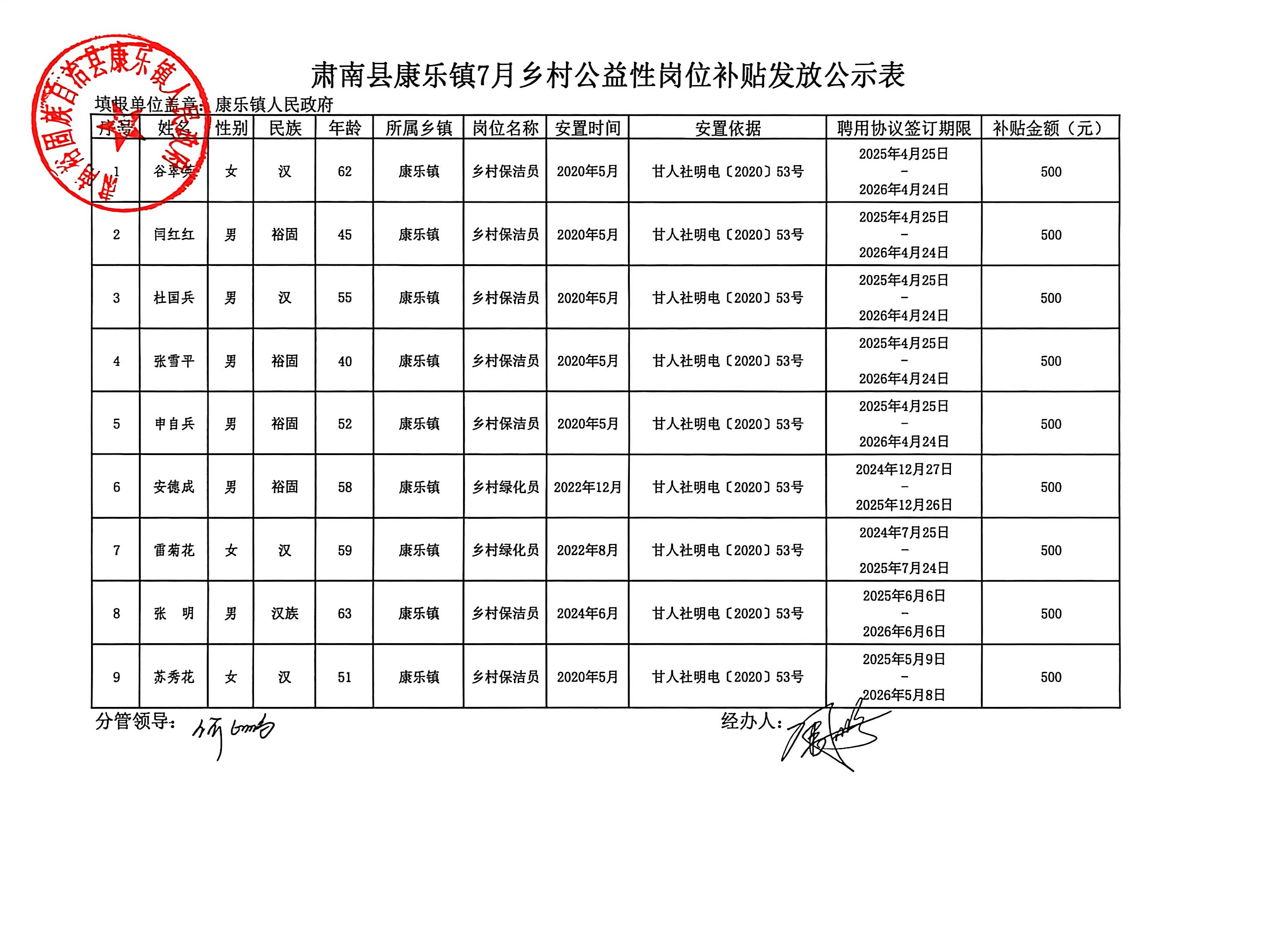 肃南县康乐镇2025年7月乡村公益性岗位补贴发放公示表