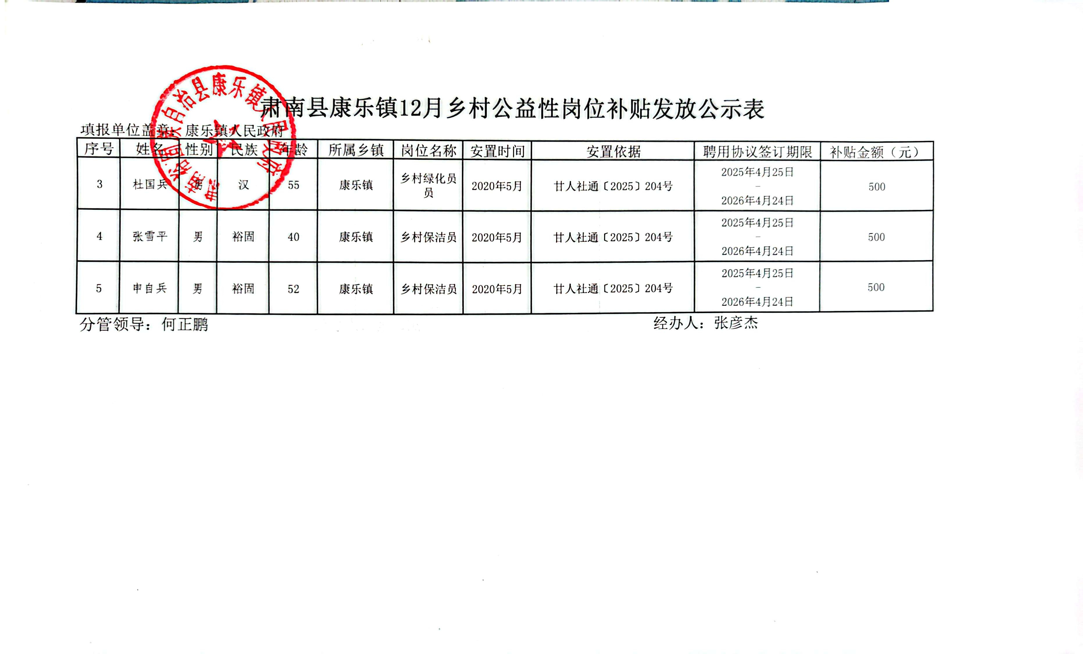 肃南县康乐镇12月乡村公益性岗位补贴发放公示表