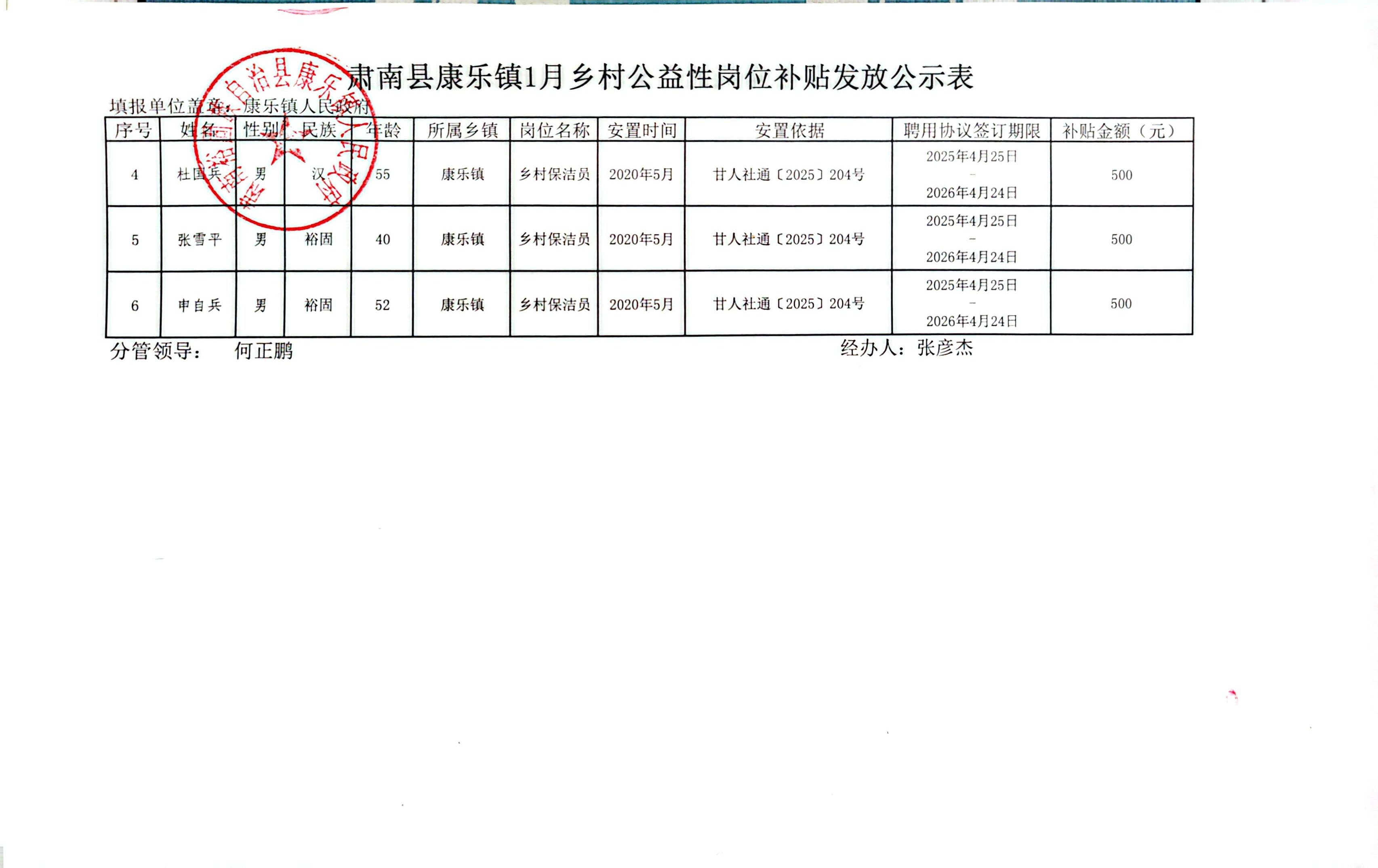 肃南县康乐镇2026年1月乡村公益性岗位补贴发放公示表