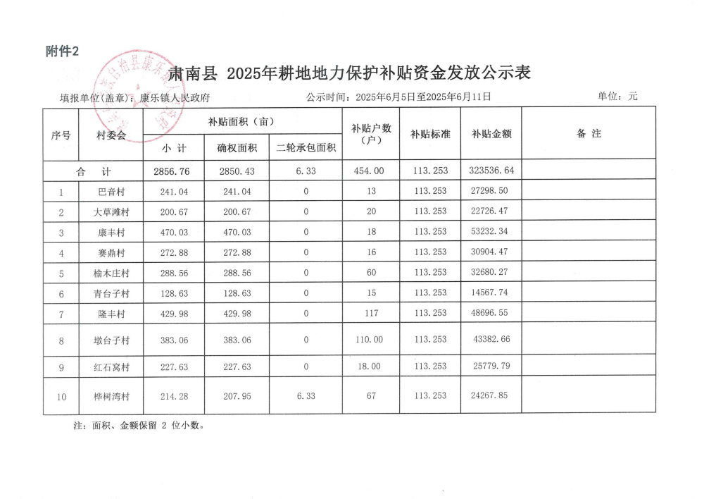 肃南县康乐镇2025年耕地地力保护补贴资金发放公示表