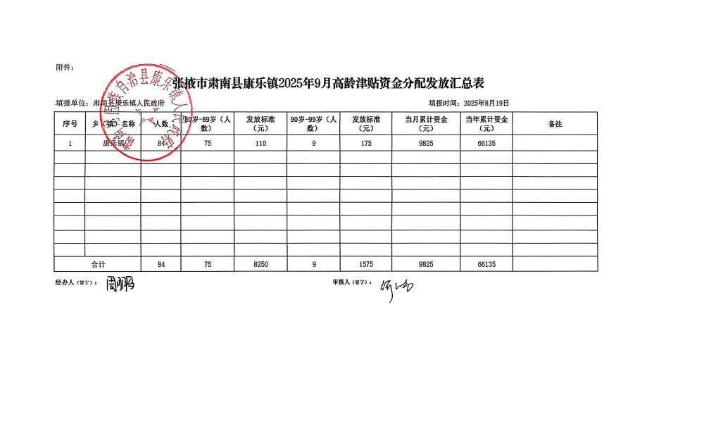 张掖市肃南县康乐镇2025年9月高龄津贴资金分配发放汇总表