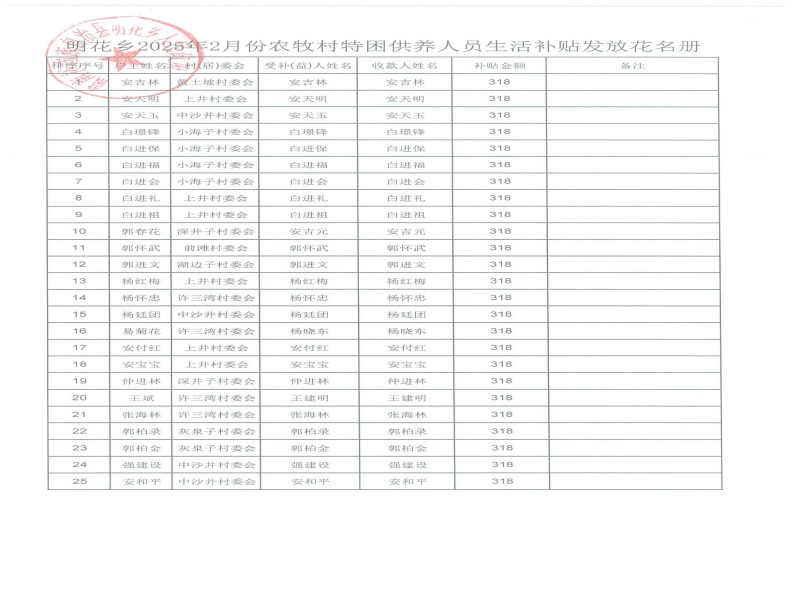 2025年2月农牧村特困供养人员生活补贴发放名单
