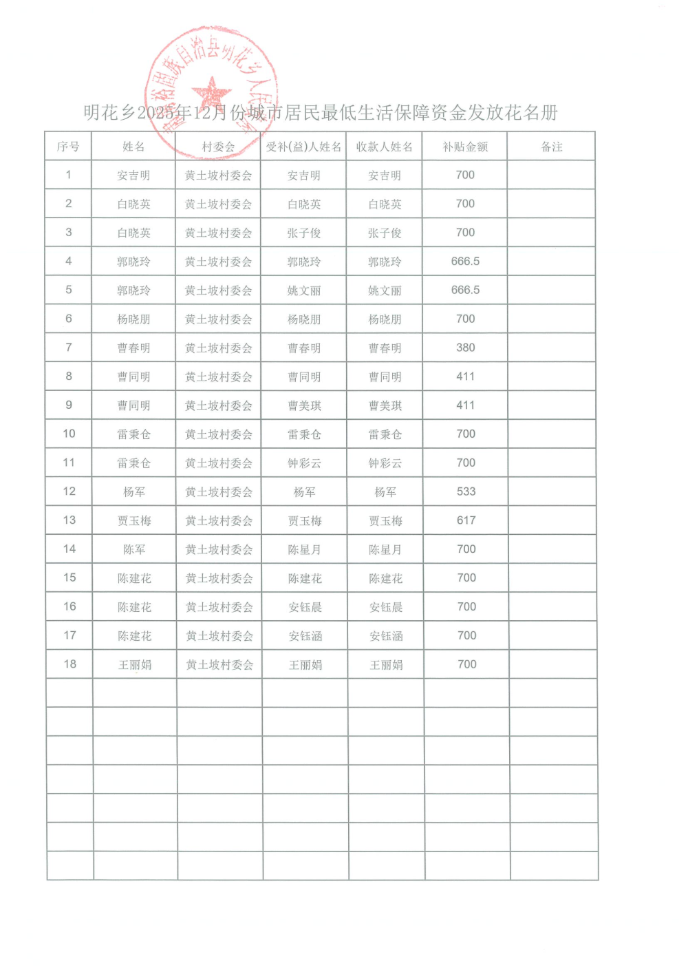2025年12月城市居民最低生活保障资金发放名单