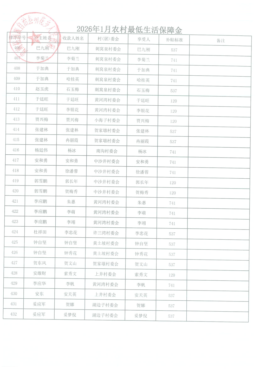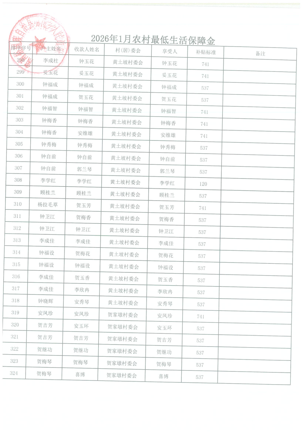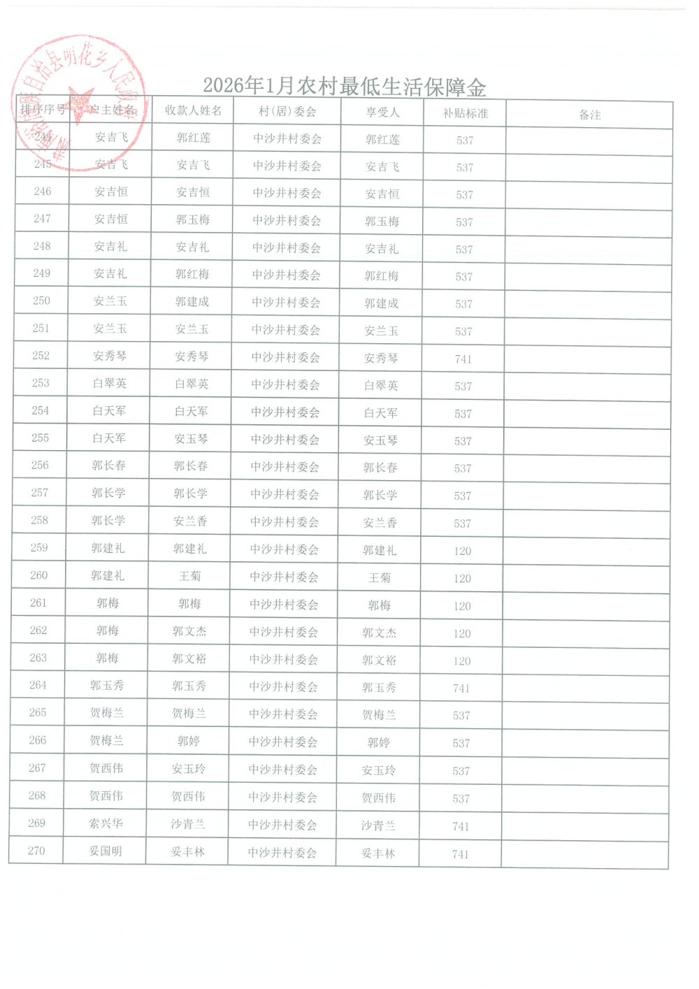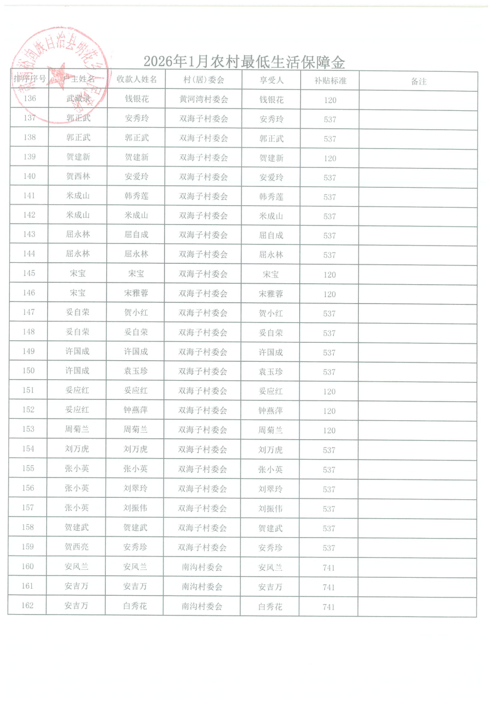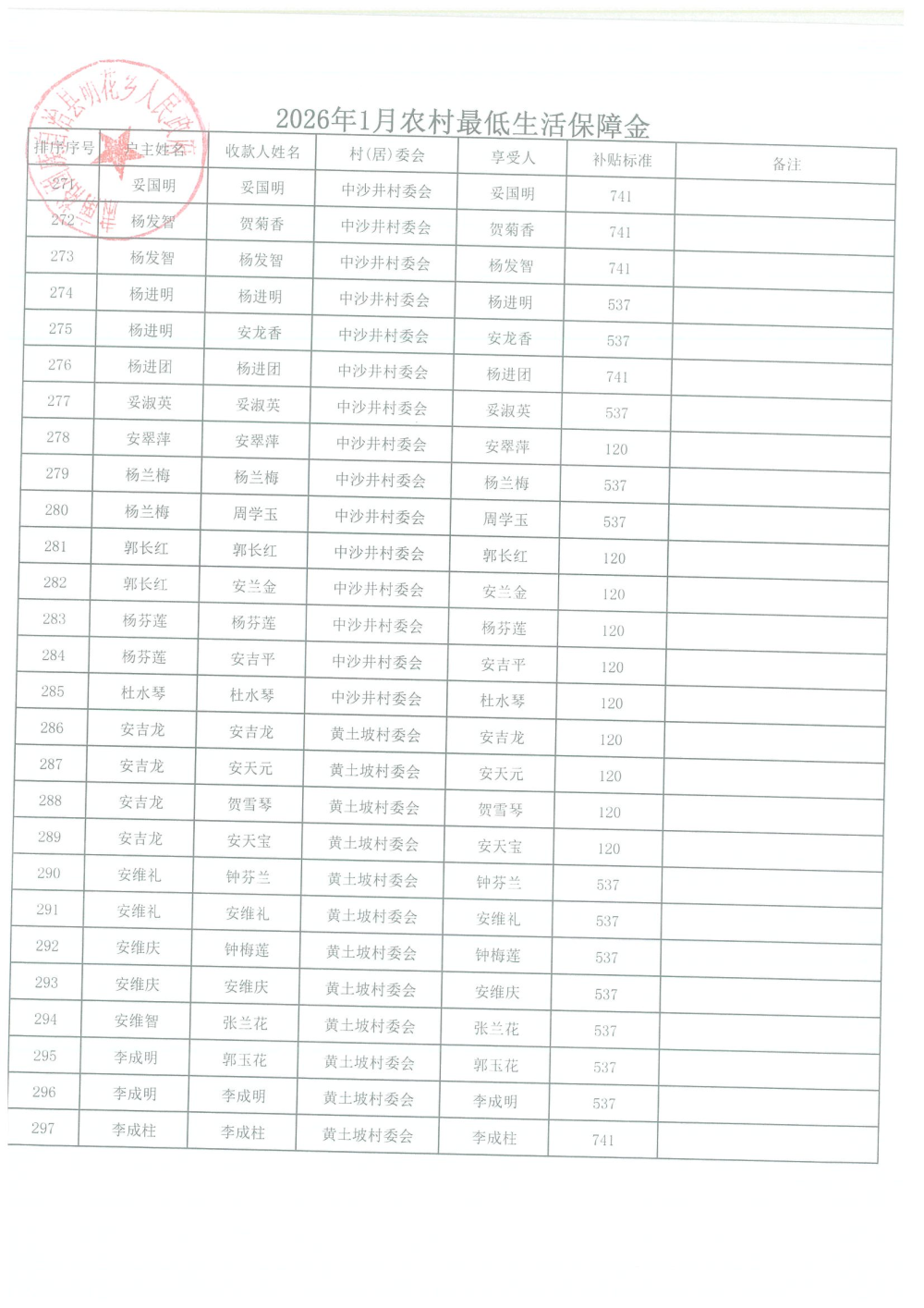 2026年1月农村居民最低生活保障资金发放名单