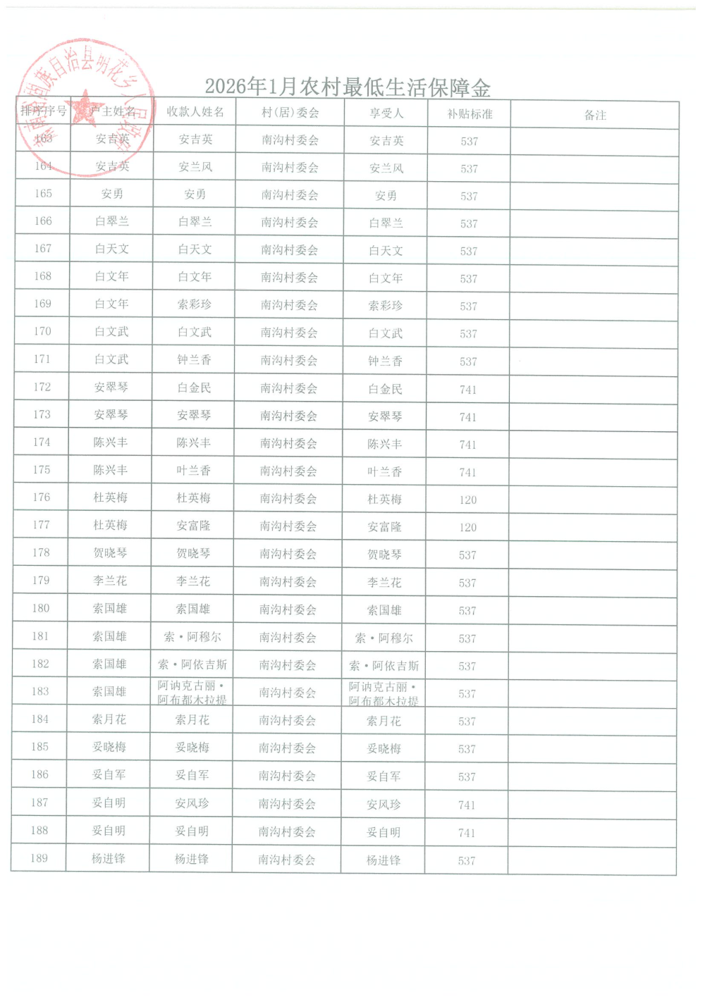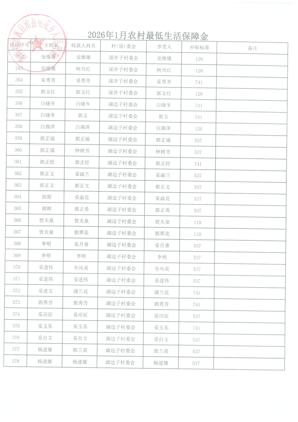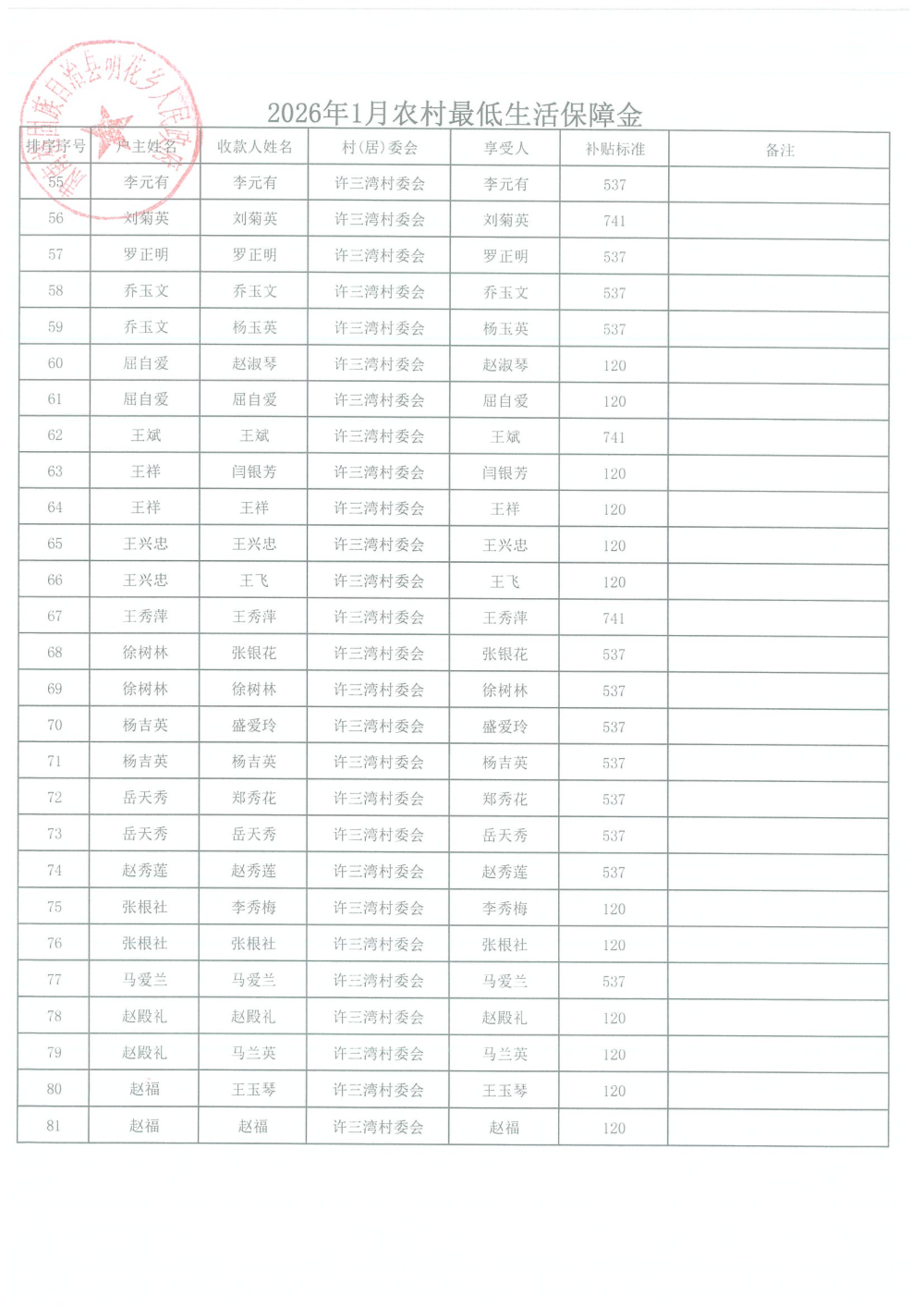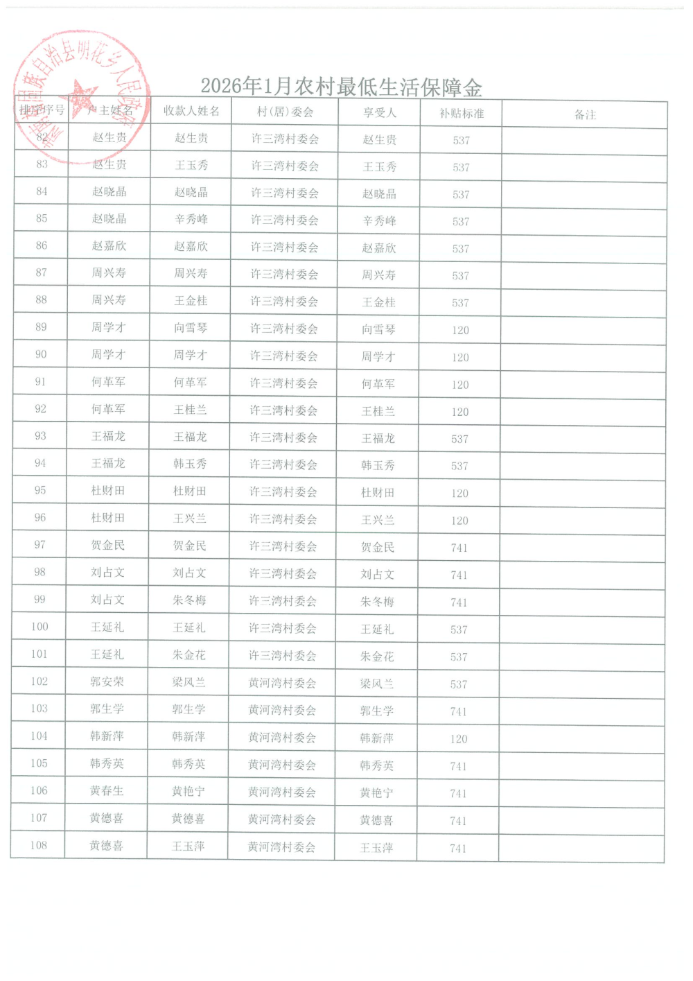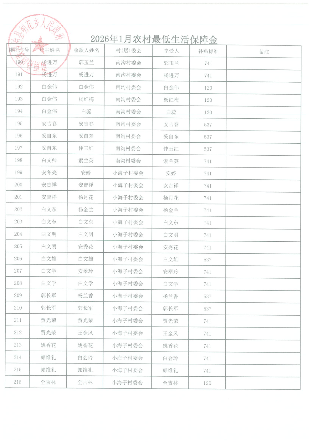 2026年1月农村居民最低生活保障资金发放名单
