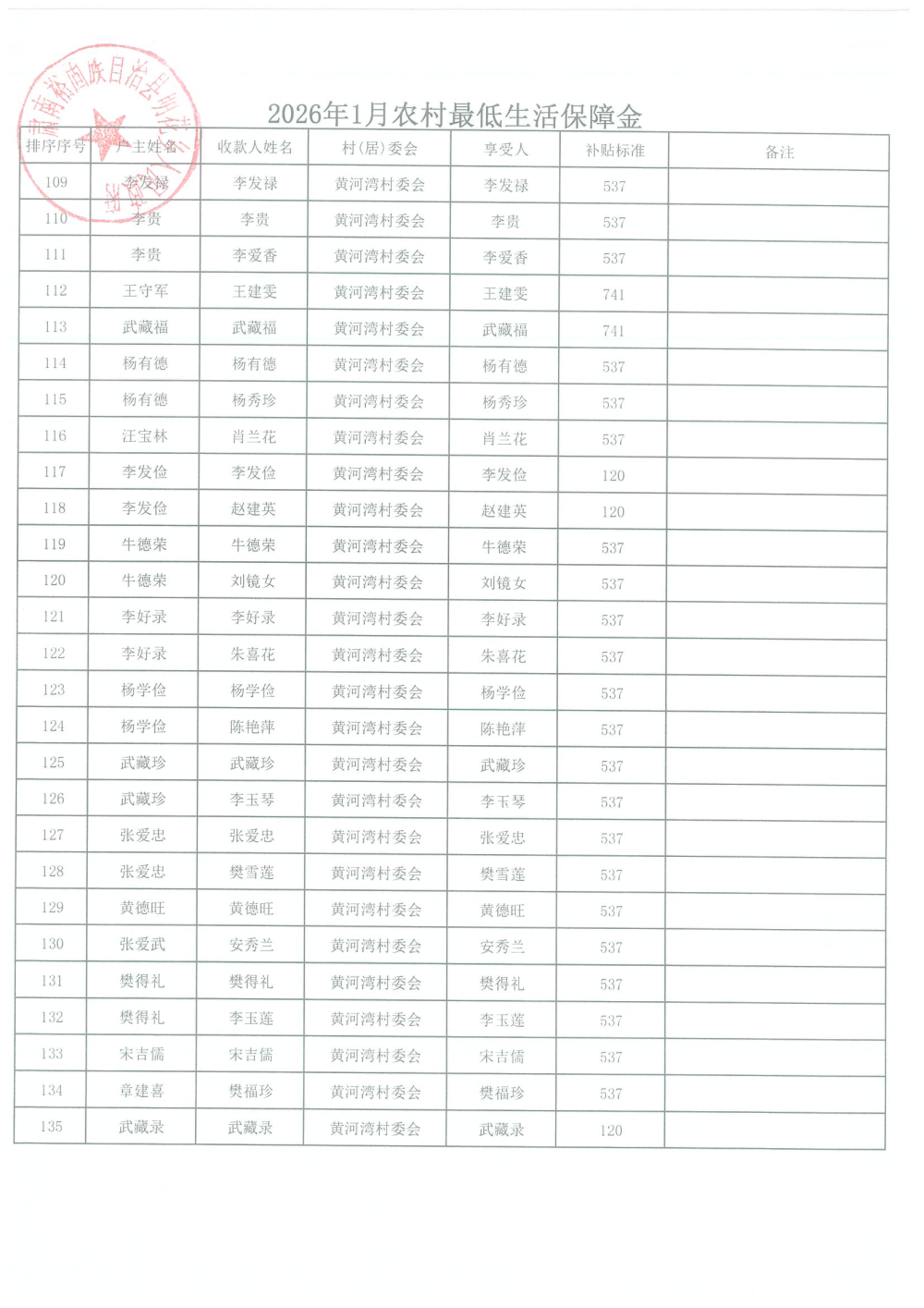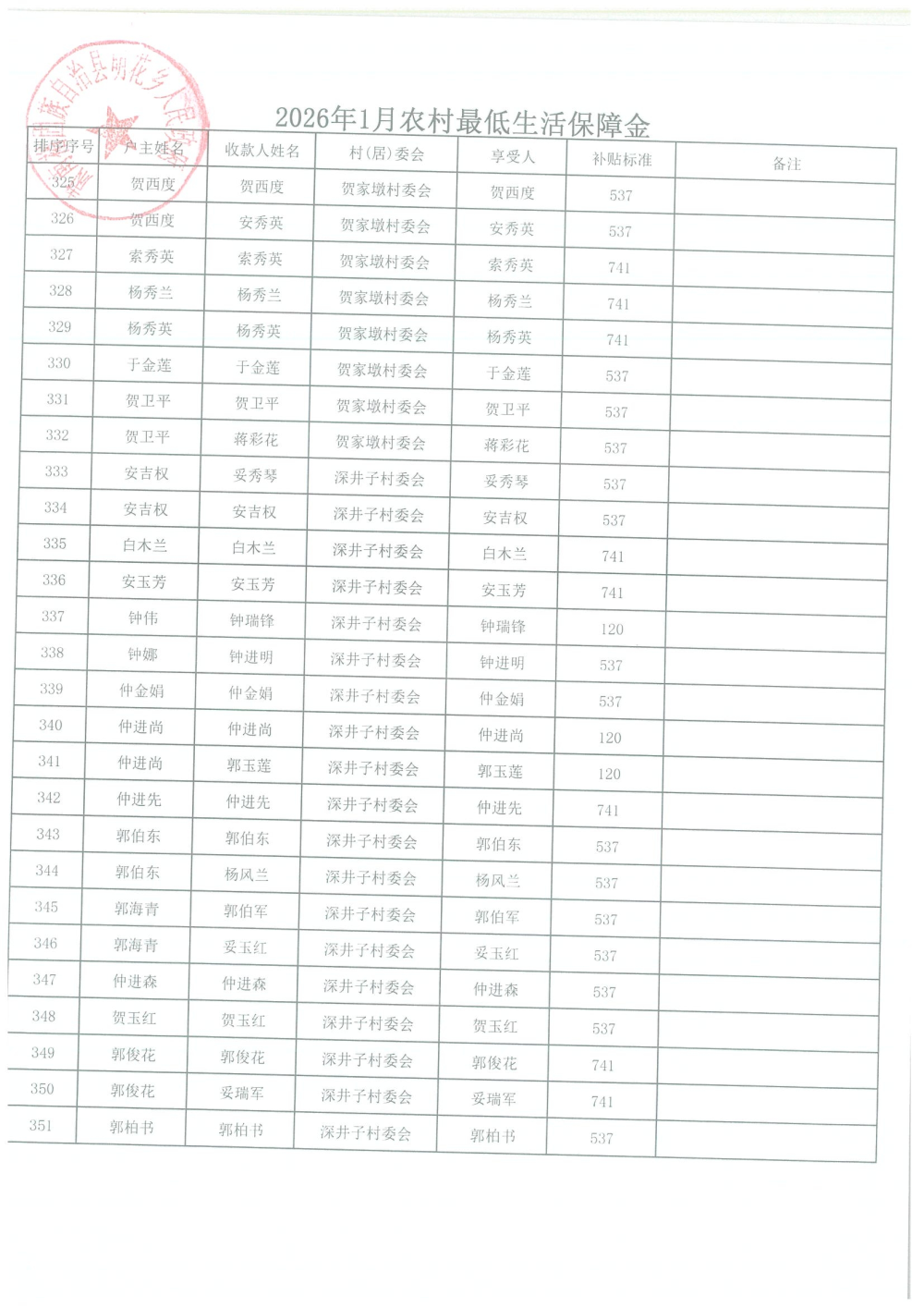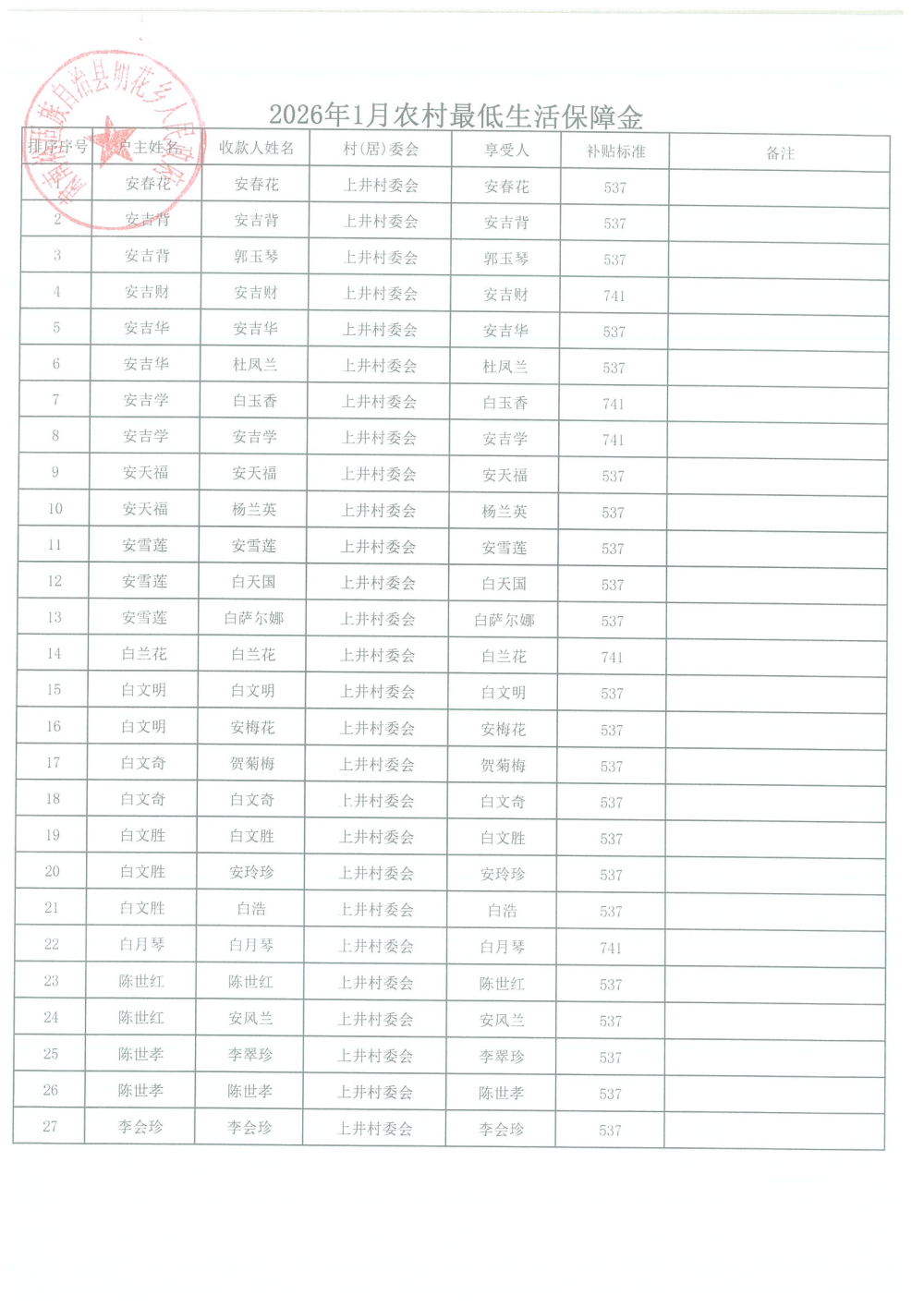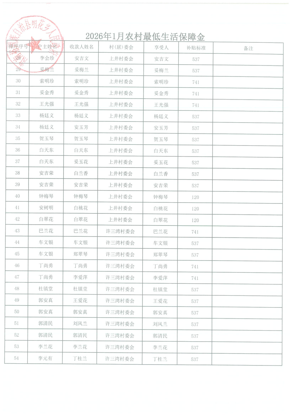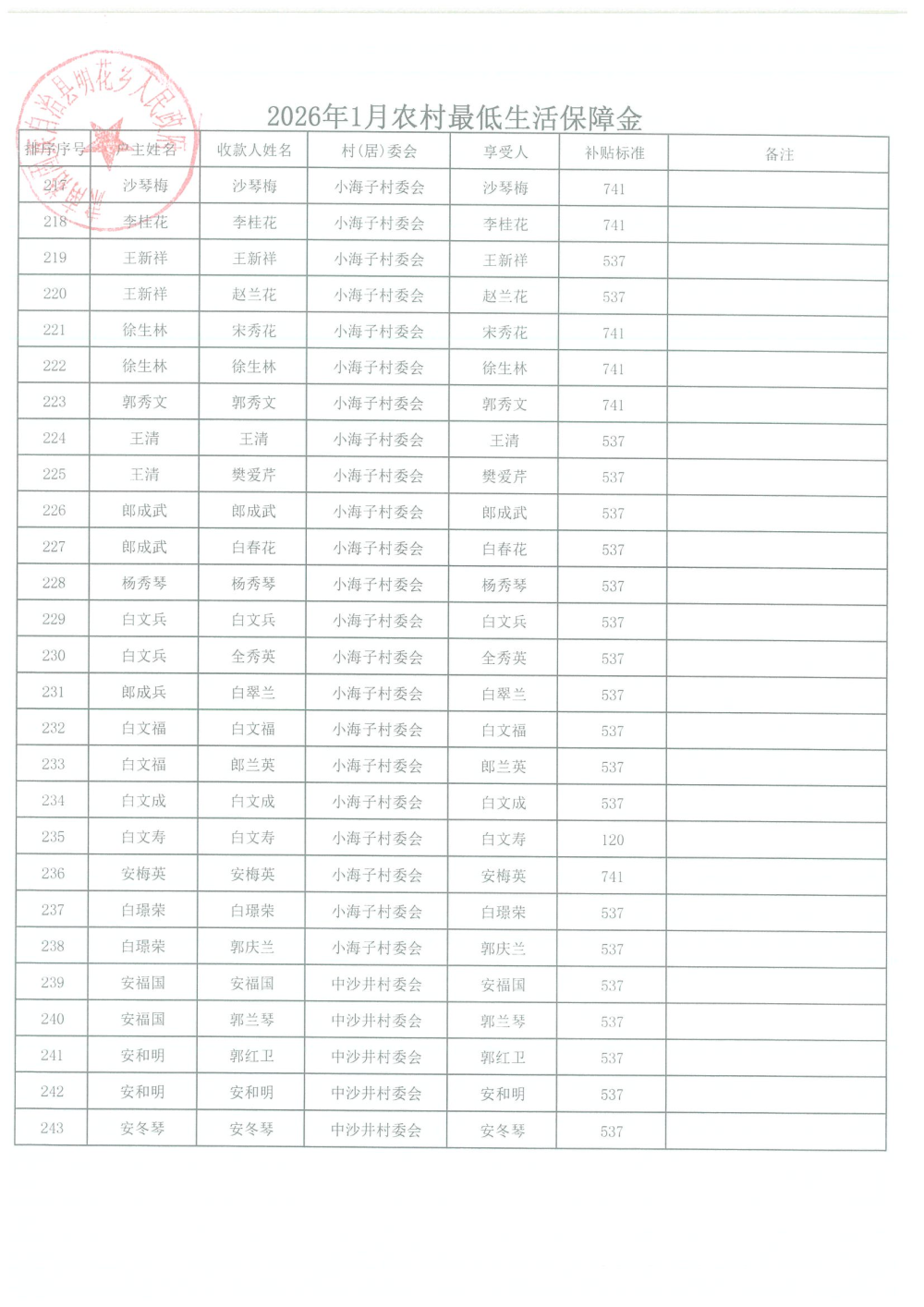 2026年1月农村居民最低生活保障资金发放名单