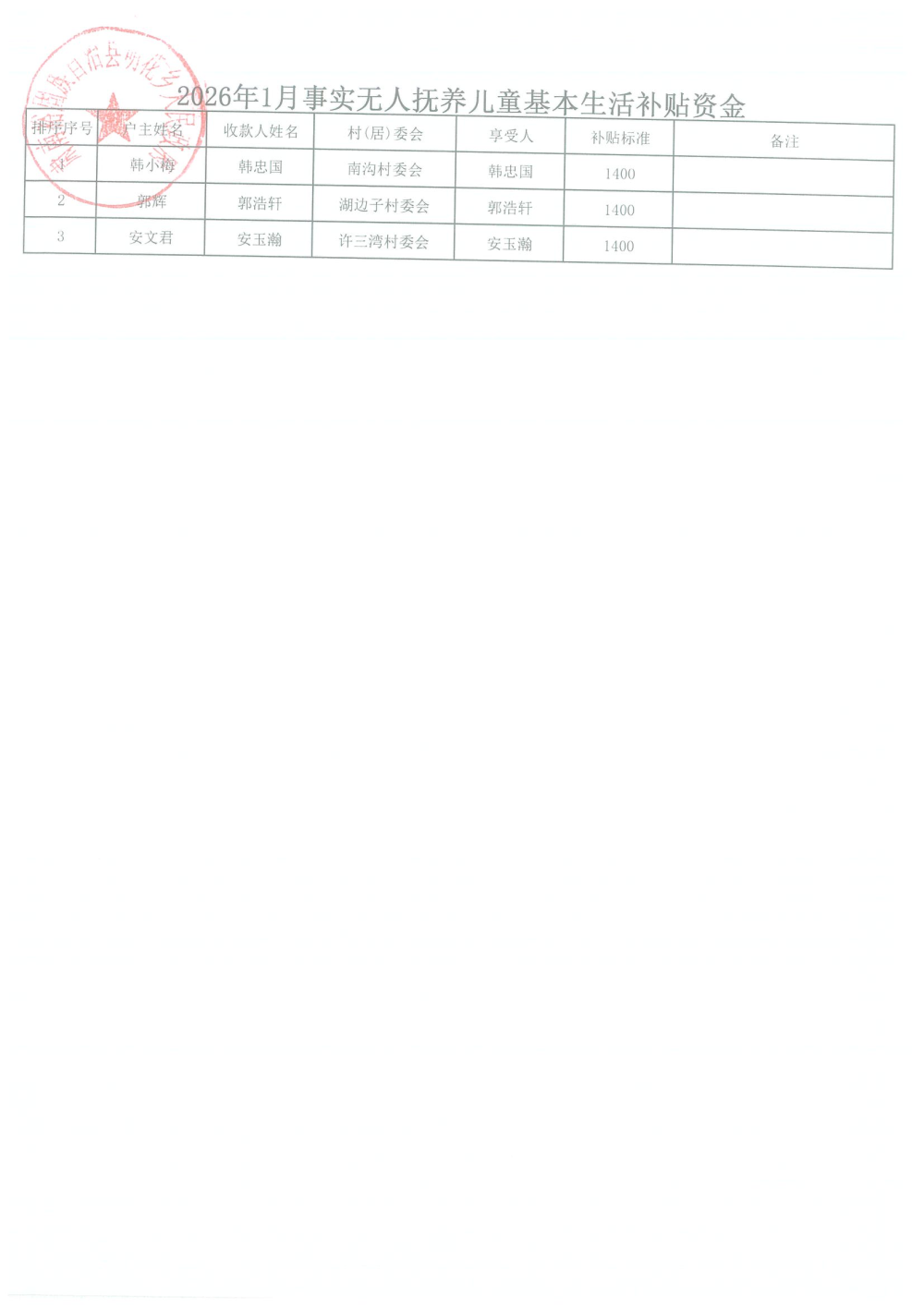 2026年1月农村事实无人抚养儿童生活补贴发放名单