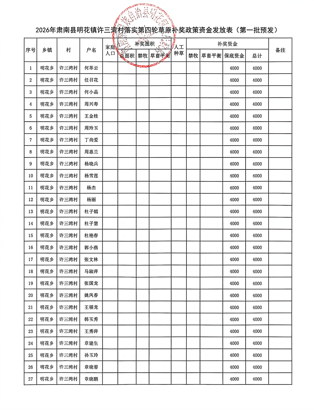 2026年肃南县明花镇许三湾村落实第四轮草原补奖政策资金发放表