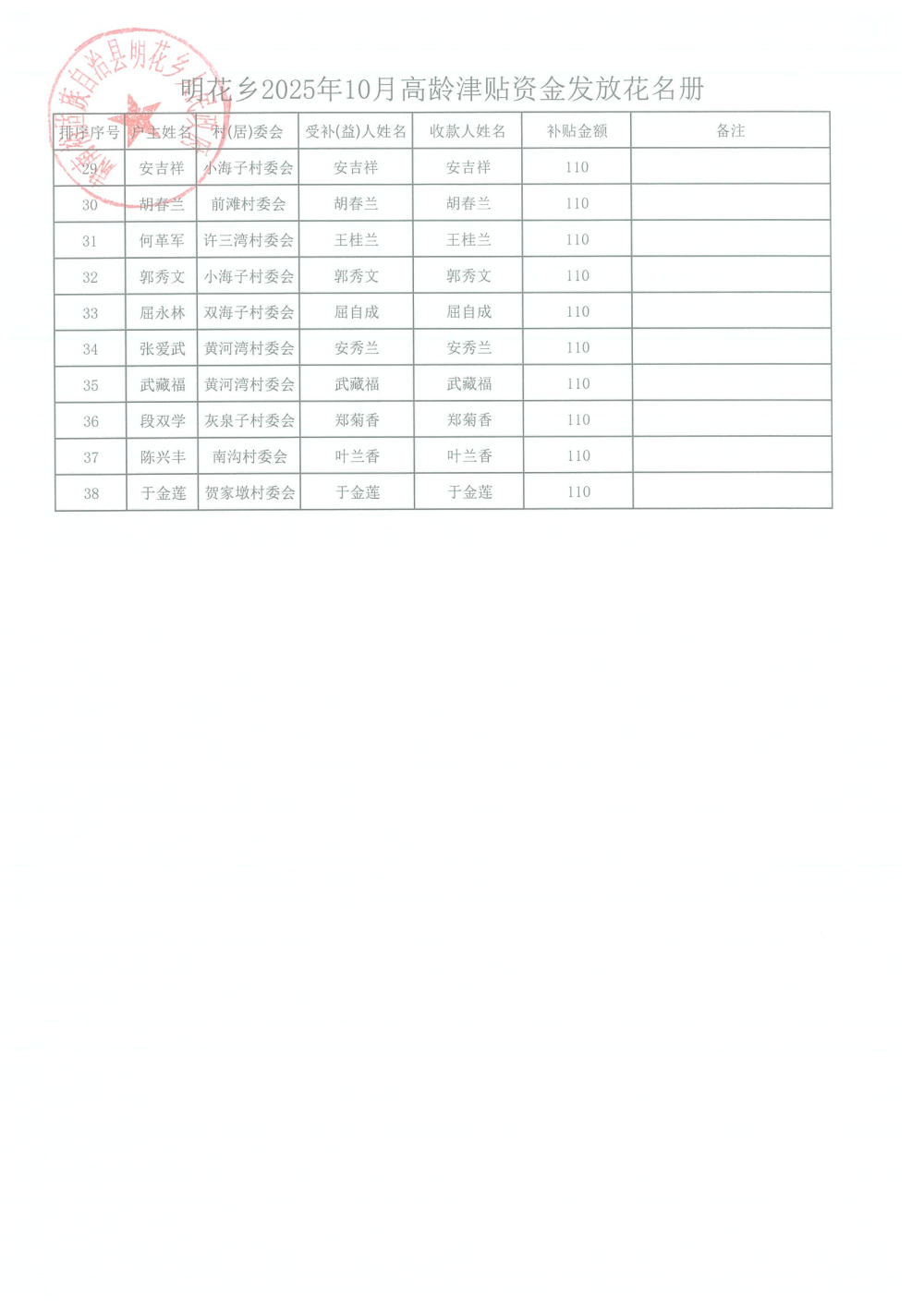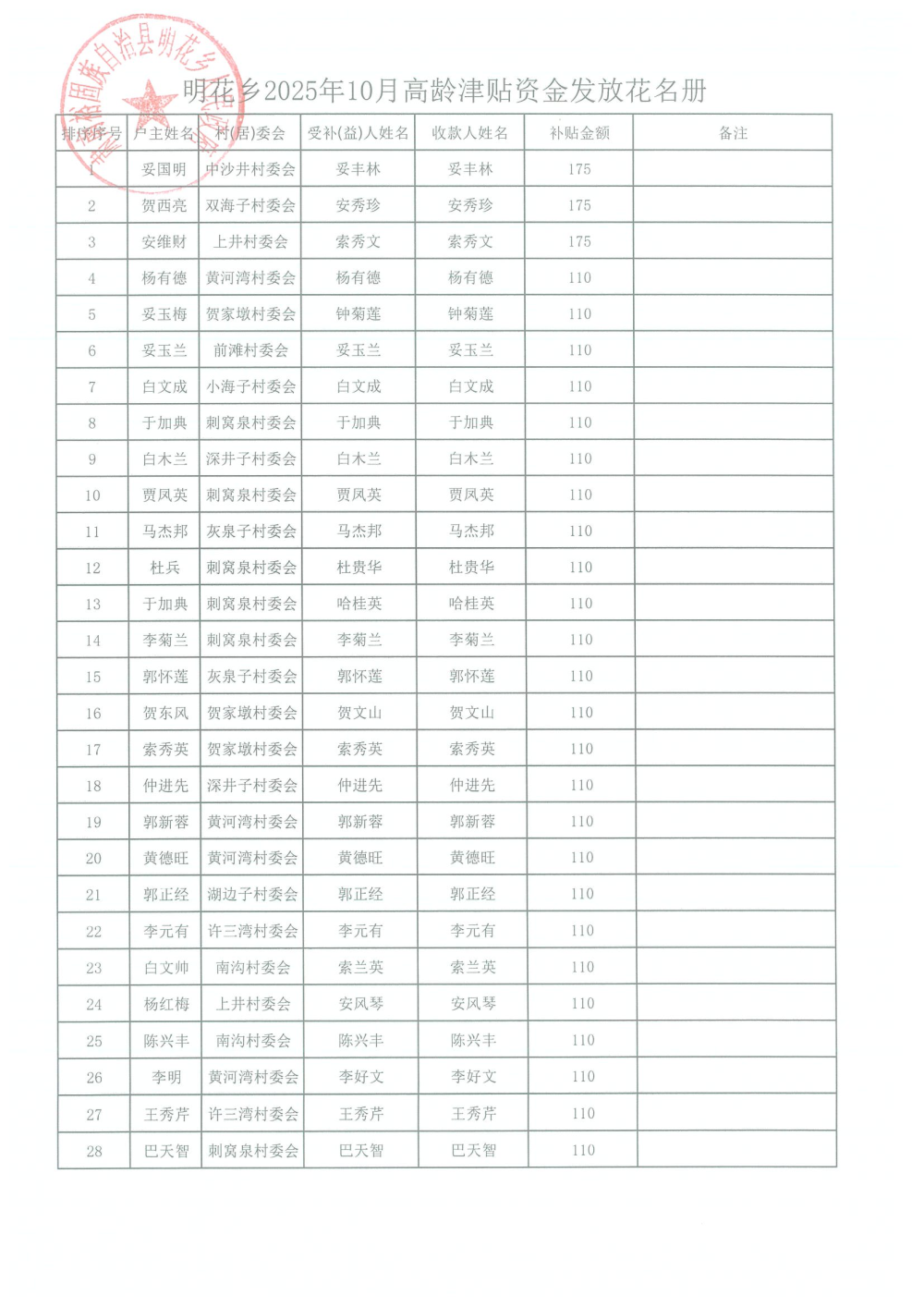 2025年10月高龄津贴资金发放表