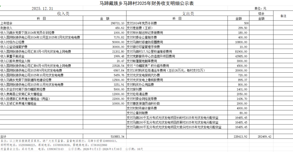 马蹄藏族乡马蹄村2025年第四季度财务收支明细公示表