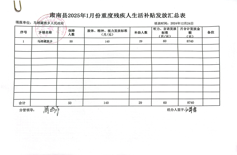 马蹄乡2025年1月困难残疾人补贴资金发放公开