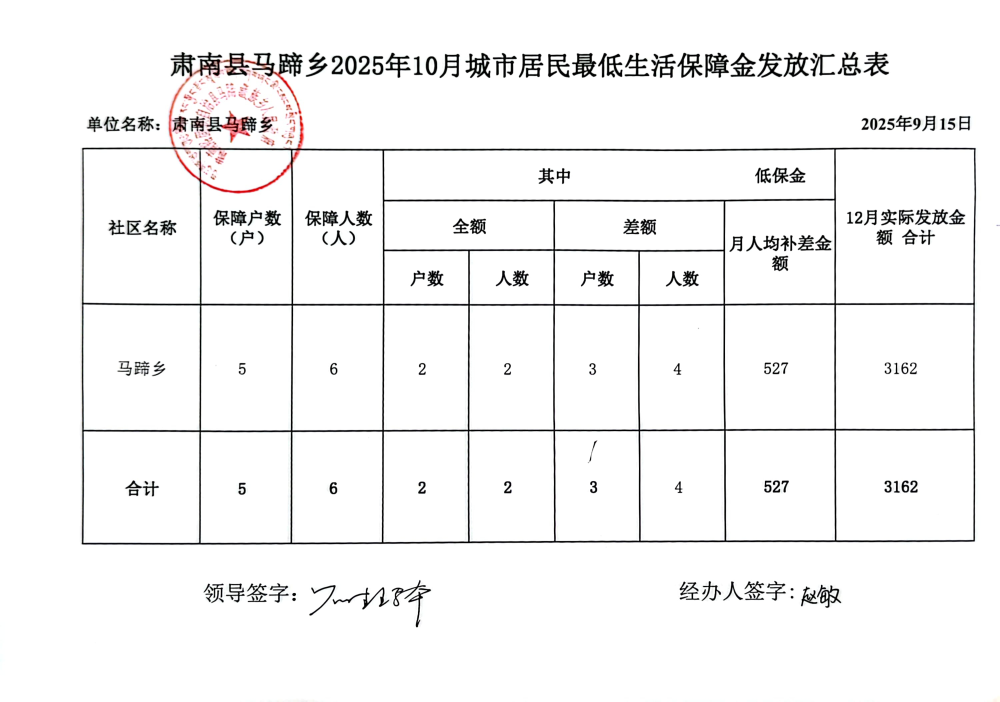 马蹄藏族乡2025年10月份城乡城市居民最低生活保障资金发放表