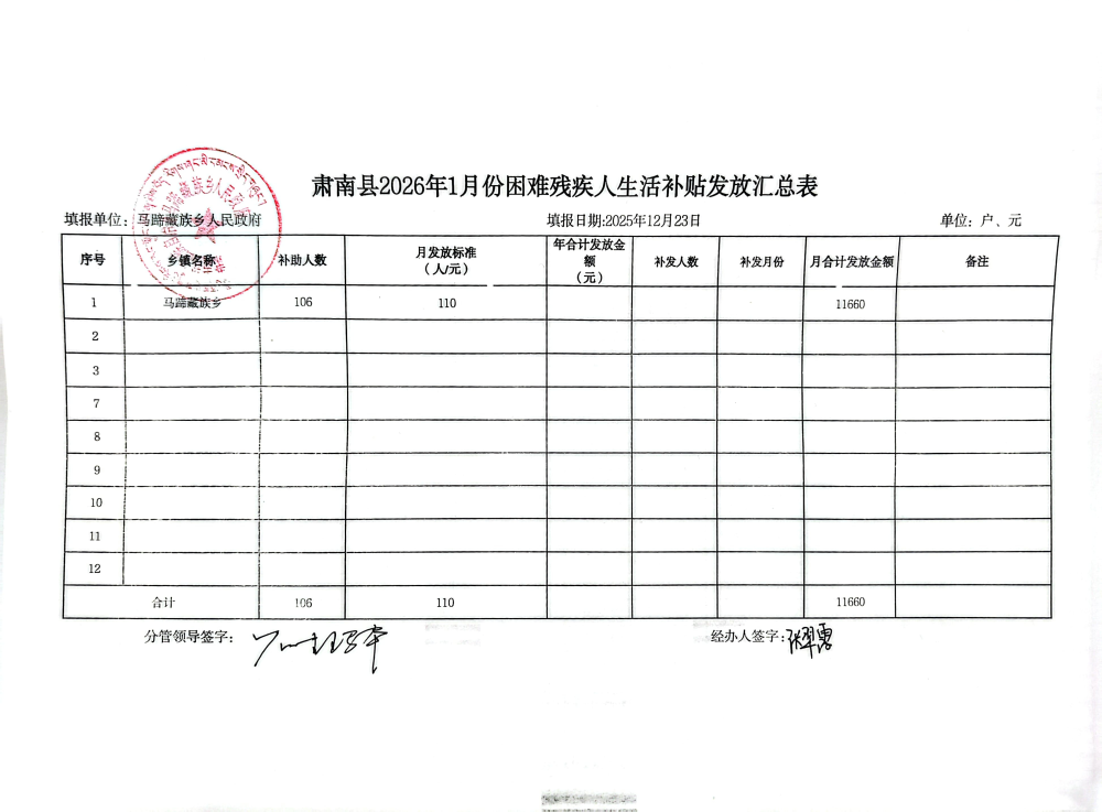 马蹄乡2026年1月困难残疾人补贴资金发放公开1