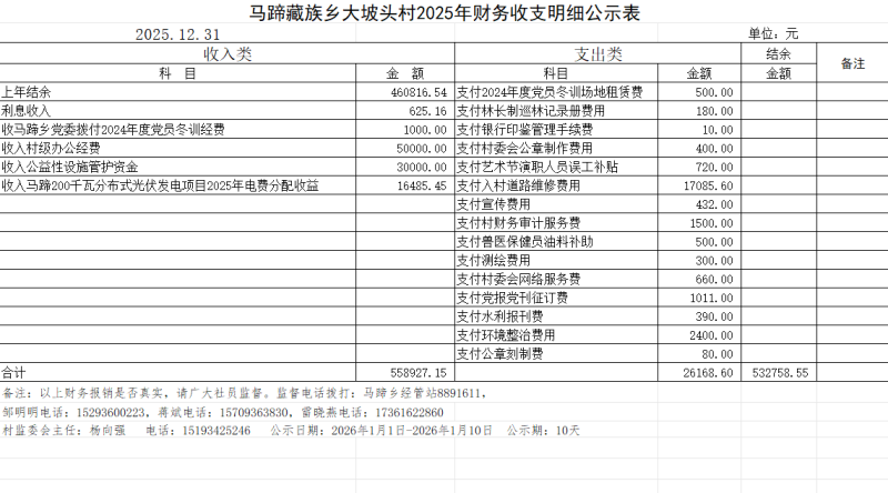马蹄藏族乡大坡头村2025年第四季度财务收支明细公示表