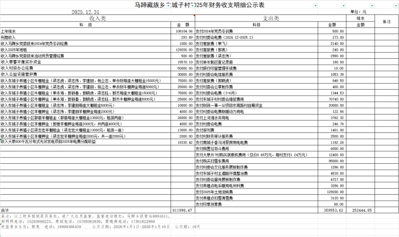 马蹄藏族乡东城子村2025年第四季度财务收支明细公示表