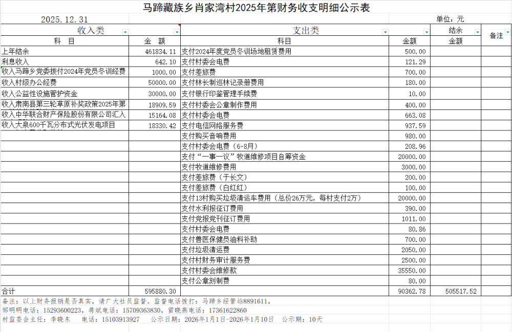 马蹄藏族乡肖家湾村2025年第四季度财务收支明细公示表