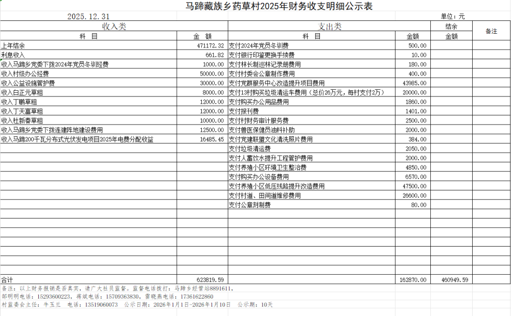 马蹄藏族乡药草村2025年第四季度财务收支明细公示表