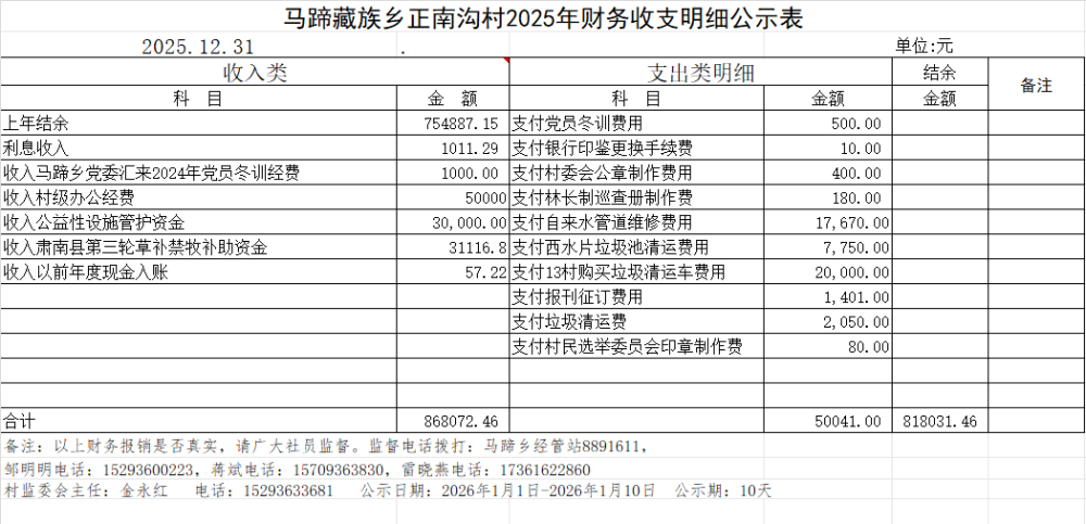 马蹄藏族乡正南沟村2025年第四季度财务收支明细公示表