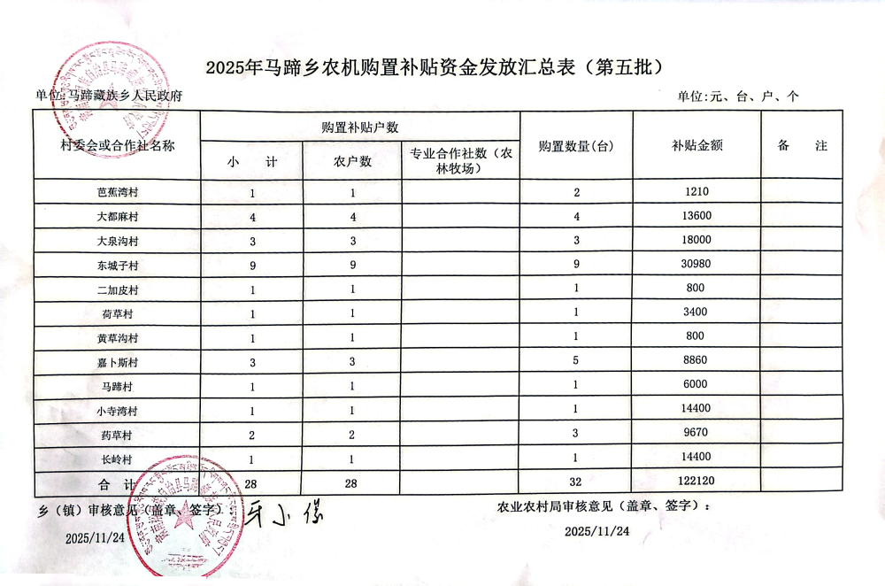 马蹄藏族乡2025年农机购置补贴资金发放汇总表(第五批)
