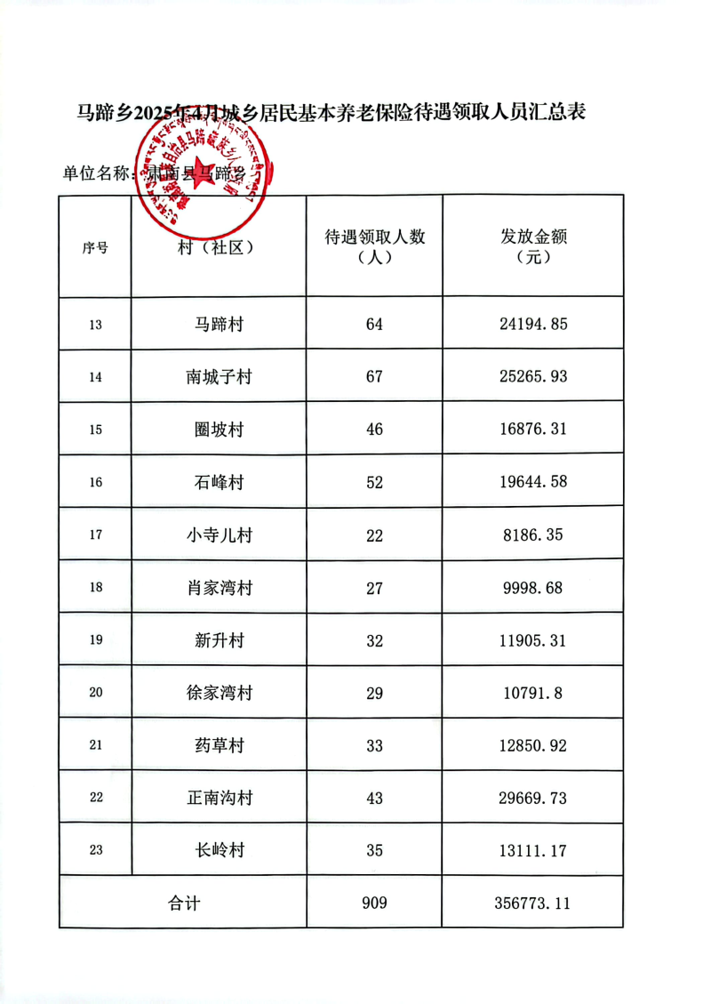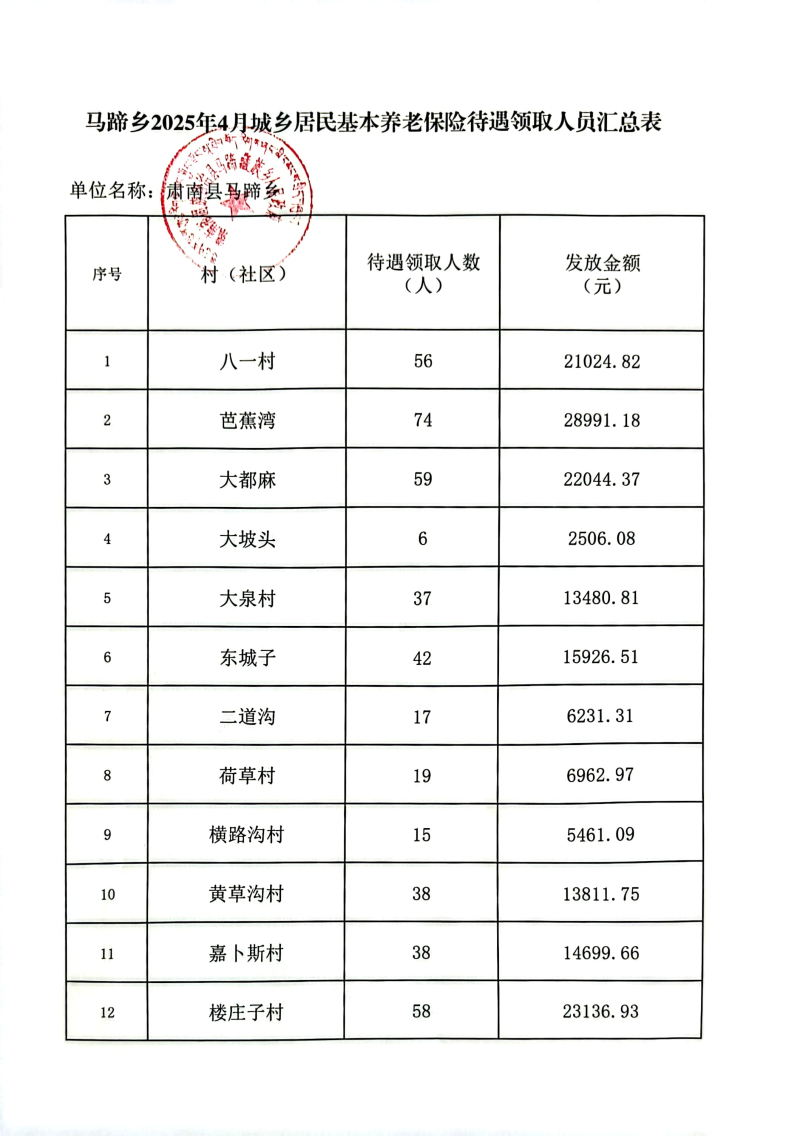 马蹄乡2025年4月城乡居民基本养老保险待遇领取公示