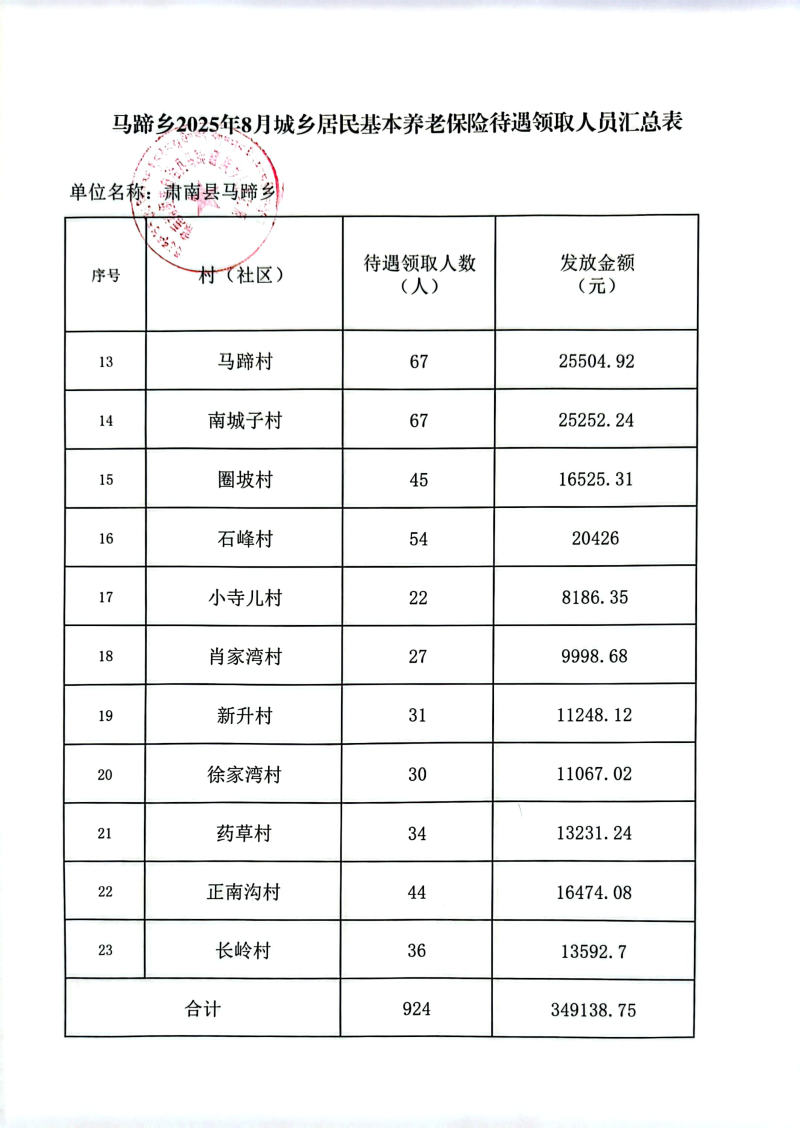 马蹄乡2025年8月城乡居民基本养老保险待遇领取公示