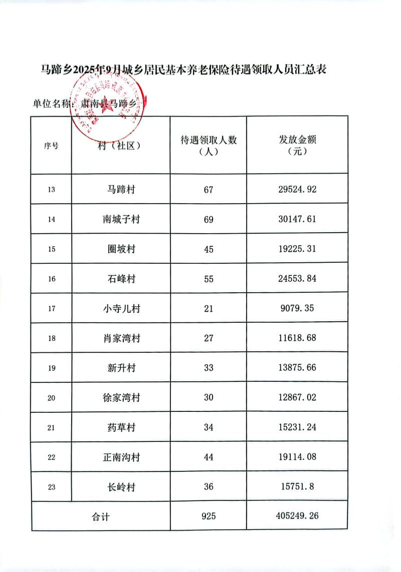马蹄乡2025年9月城乡居民基本养老保险待遇领取公示
