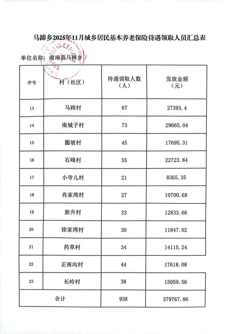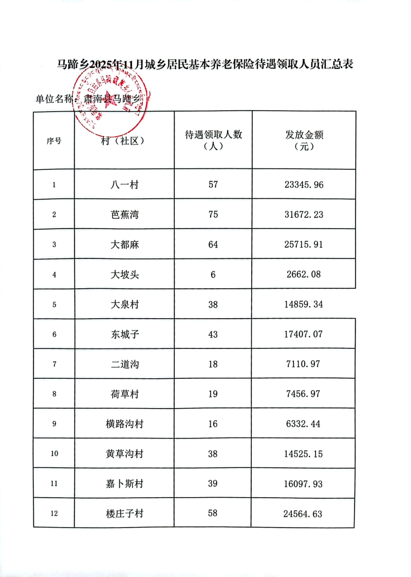 马蹄乡2025年11月城乡居民基本养老保险待遇领取公示